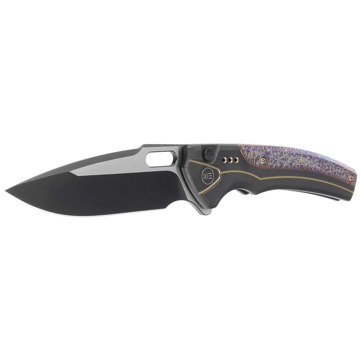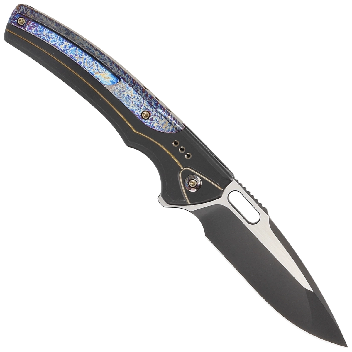 Handle - made of solid titanium 6AL4V anodized black with gold accents. Contouring of the covers eliminates sharp edges. Grips are connected to each other with a flame-dyed titanium integral backspacer. The textured surface improves grip confidence. The simplicity and robustness of the design give confidence in many years of use. The single-position (right) clip, also made of flame-dyed titanium, allows the knife to be carried in the tip-up position. The pivot axis is decorated with a circle of stained titanium.