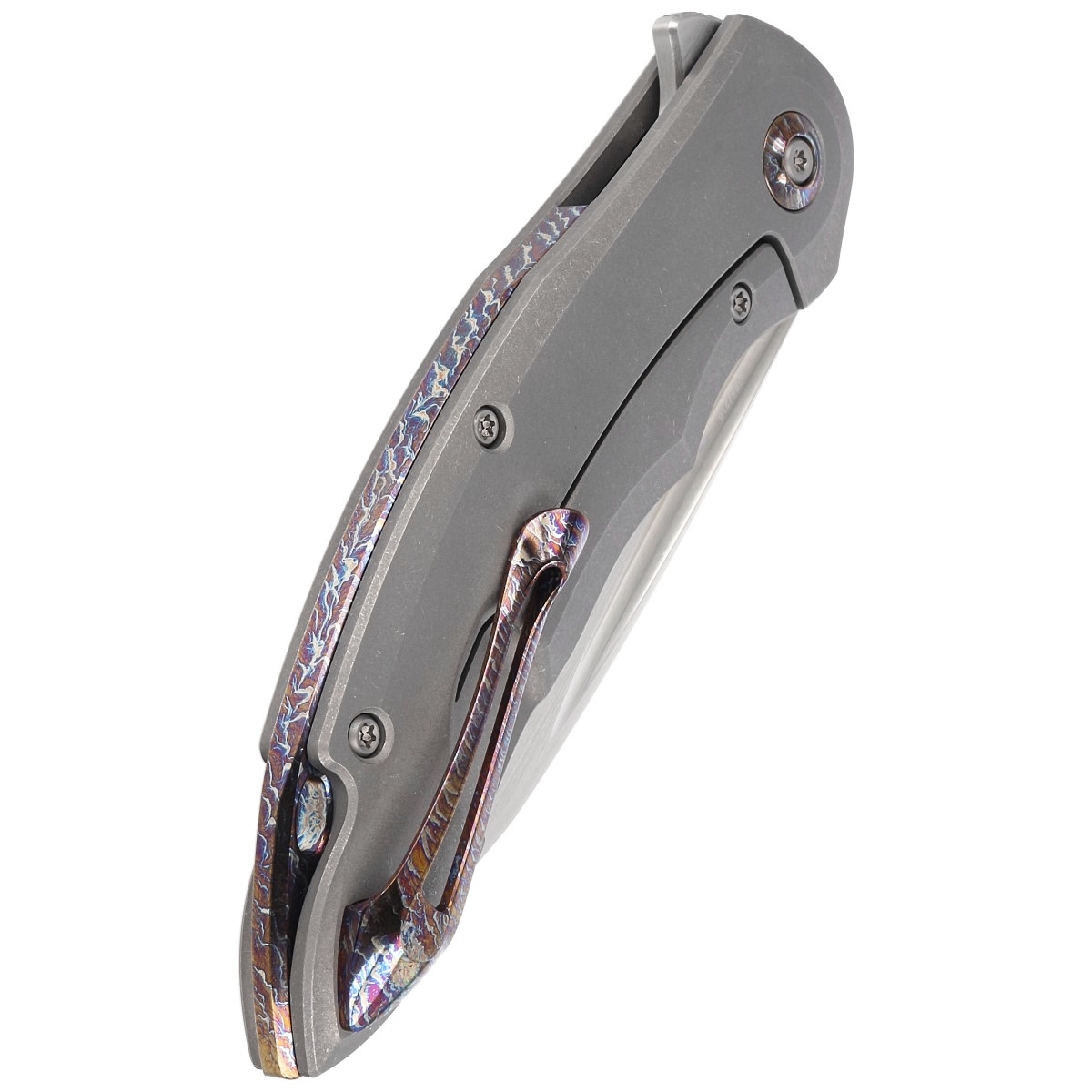 Handle - made of titanium 6AL4V. Contouring of the covers eliminates sharp edges. Grips are connected to each other with a titanium backspacer. The surface texture improves grip confidence. The simplicity and robustness of the design give confidence for many years of use. The single-position clip (right), made of titanium, allows the knife to be carried in tip-up position. At the top of the backspacer there is a place to thread a safety or decorative cord. As in other models, the pivot axis is decorated with a stylized manufacturer's logo. The clip and backspacer are made of flame-dyed 6AL4V titanium.
