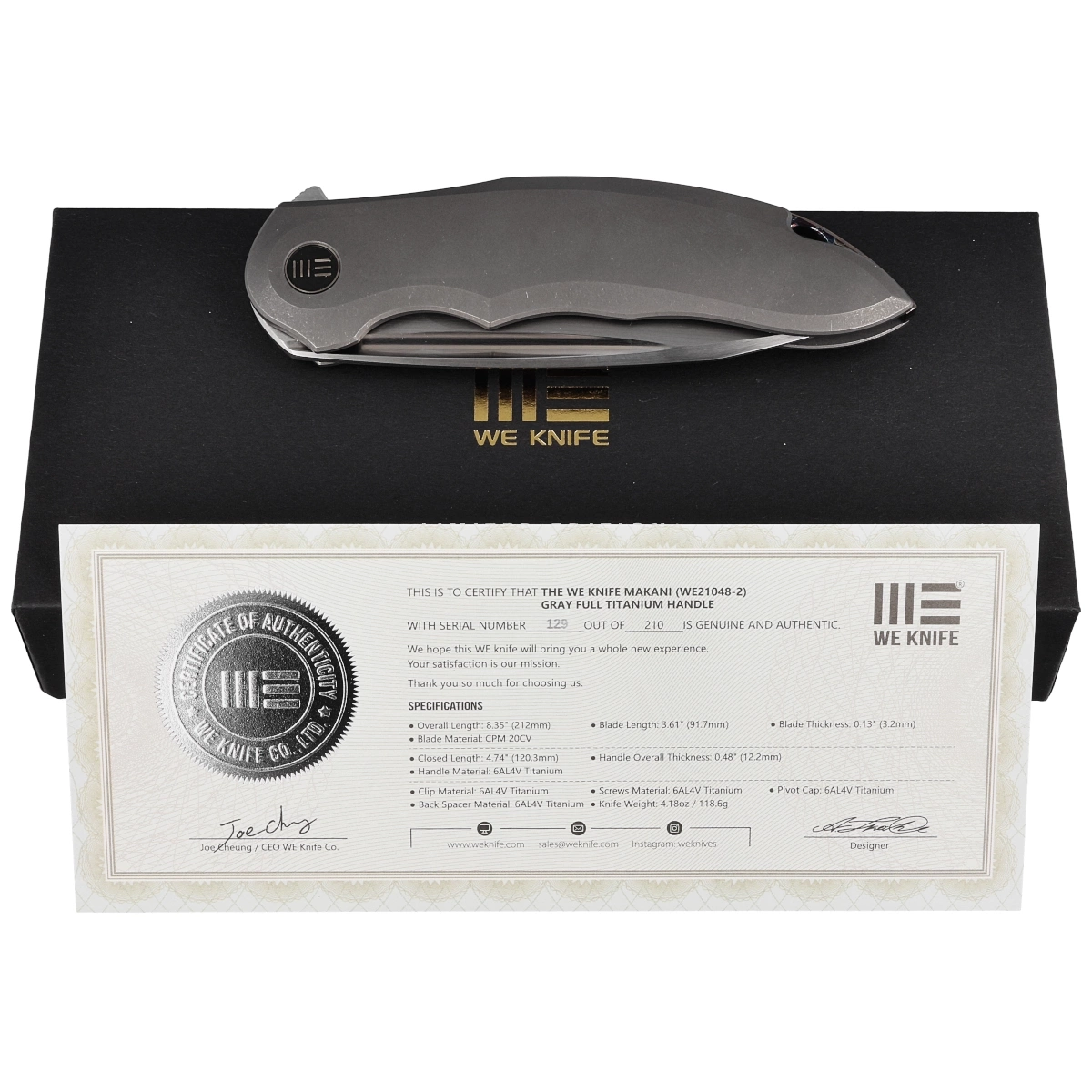 WE Knife Makani LE No 129/210 Gray Titanium, Hand Rubbed Satin CPM 20CV by Anton Tkachenko knife (WE21048-2)