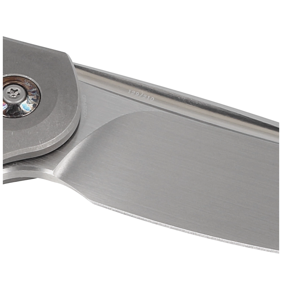 Makani LE No 129/210 Gray Titanium, Hand Rubbed Satin LE (Limited Edition). Limited edition limited to 210 pieces, folder numbered 129. A striking and powerful folder designed by Anton Tkachenko with a hand-polished satin-finished premium CPM 20CV steel blade. Handle made of titanium, with titanium clip. An absolute "must have"!