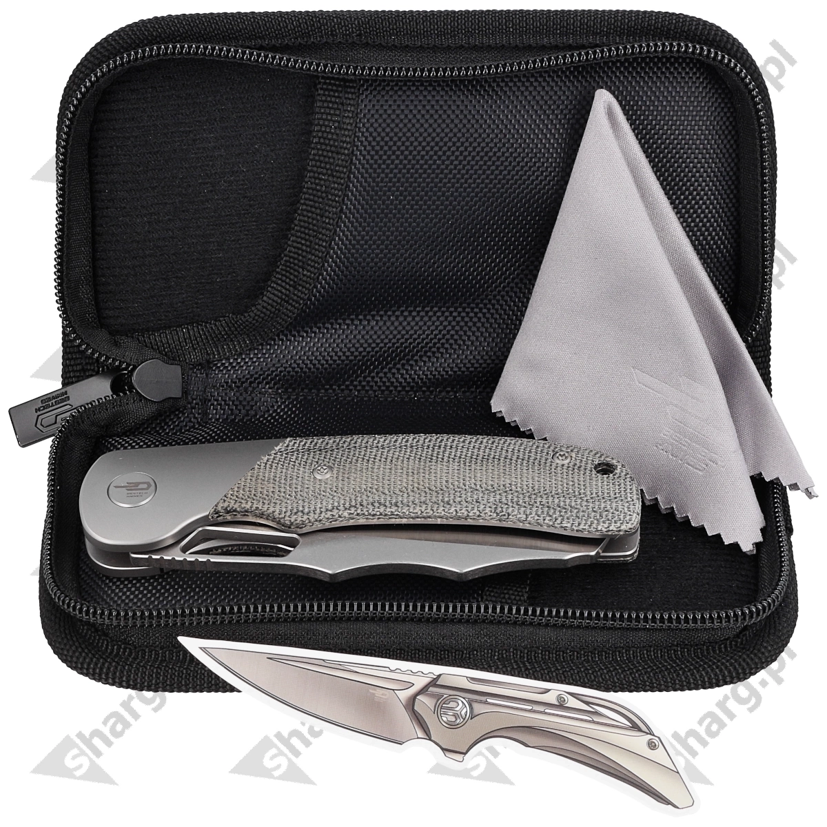 Case - the knife is packed in a zippered nylon soft pouch with the brand's logo for safe carrying and storage of the folder.