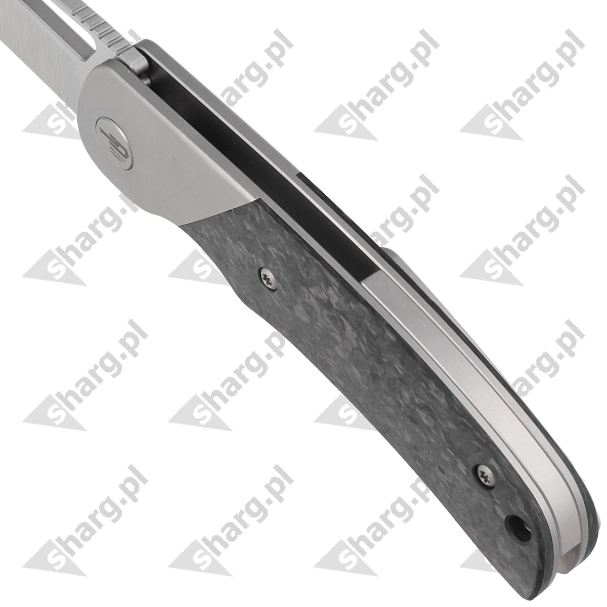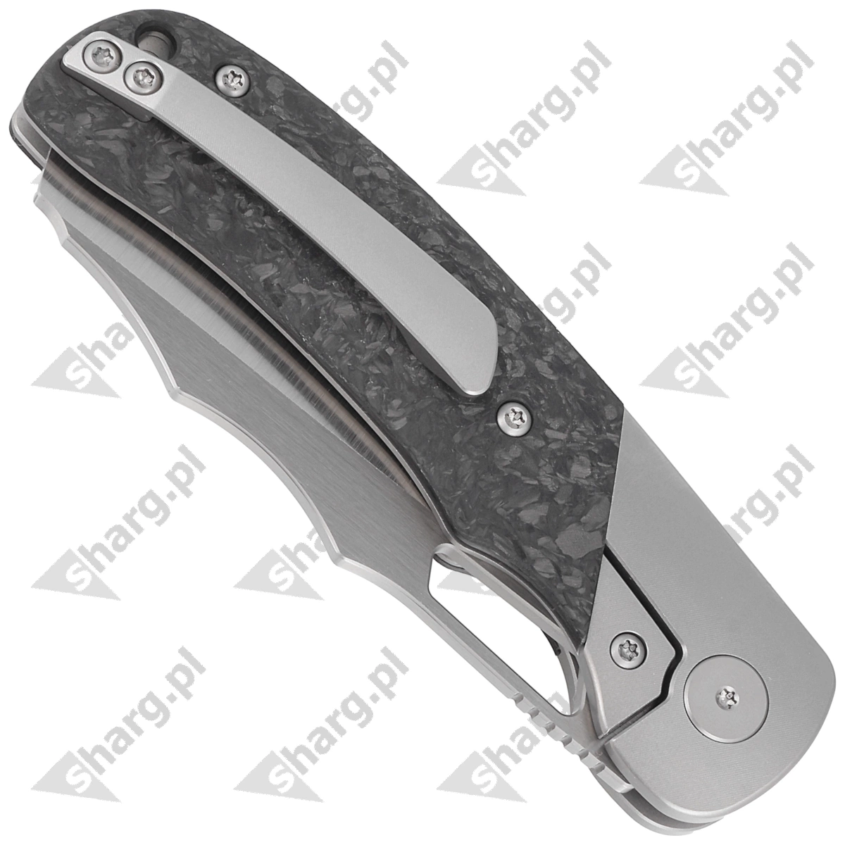 Handle - grips made of Marble Carbon Fiber, a virtually indestructible plastic that is insensitive to weather conditions, resistant to chemicals and mechanical damage, and titanium bolsters. The titanium backspacer to which the grips are attached guarantees the rigidity and strength of the entire structure. A single-position, right-handed titanium clip allows the knife to be carried in the tip-up position, with the tip of the blade upward. Above the clip a hole for threading a safety or decorative cord.