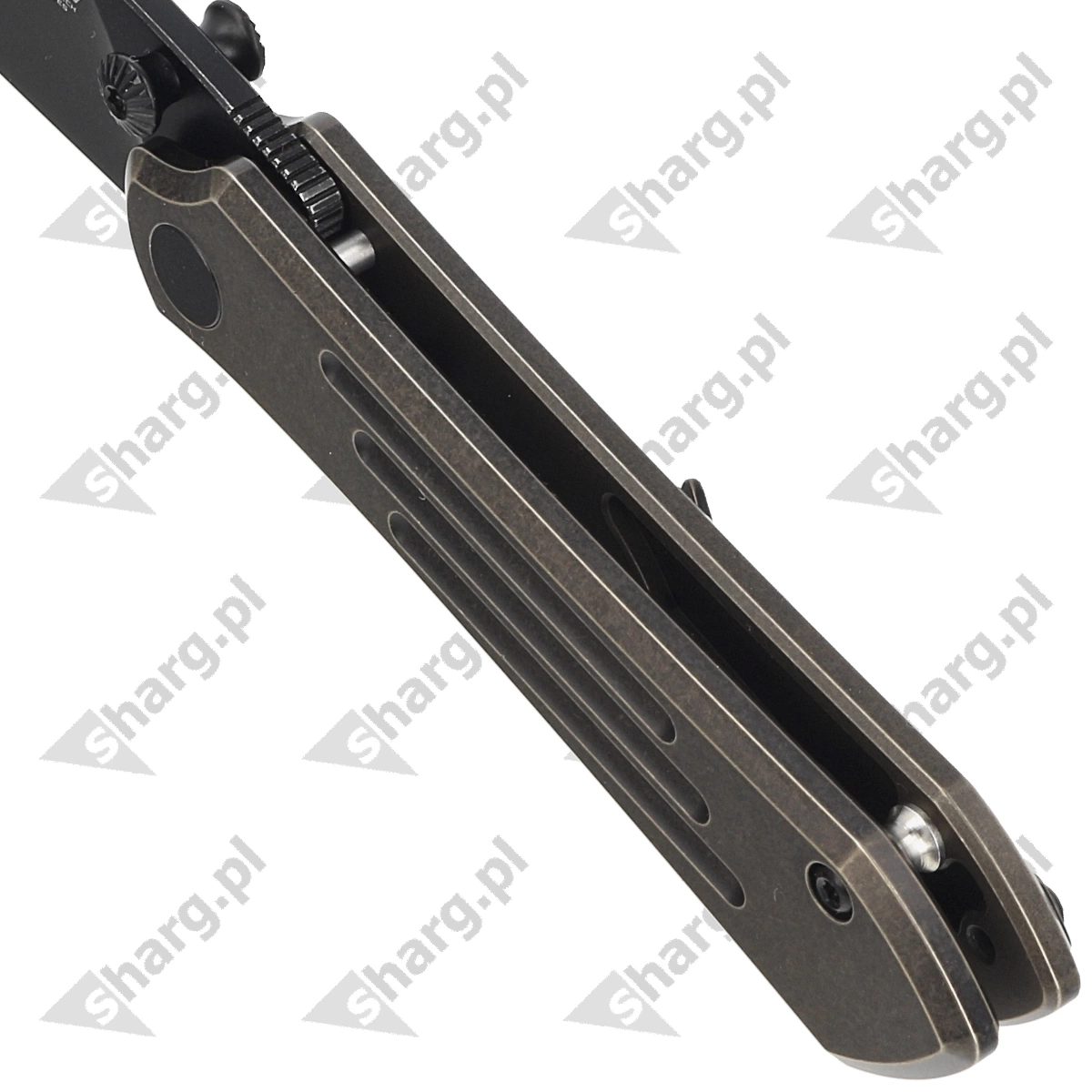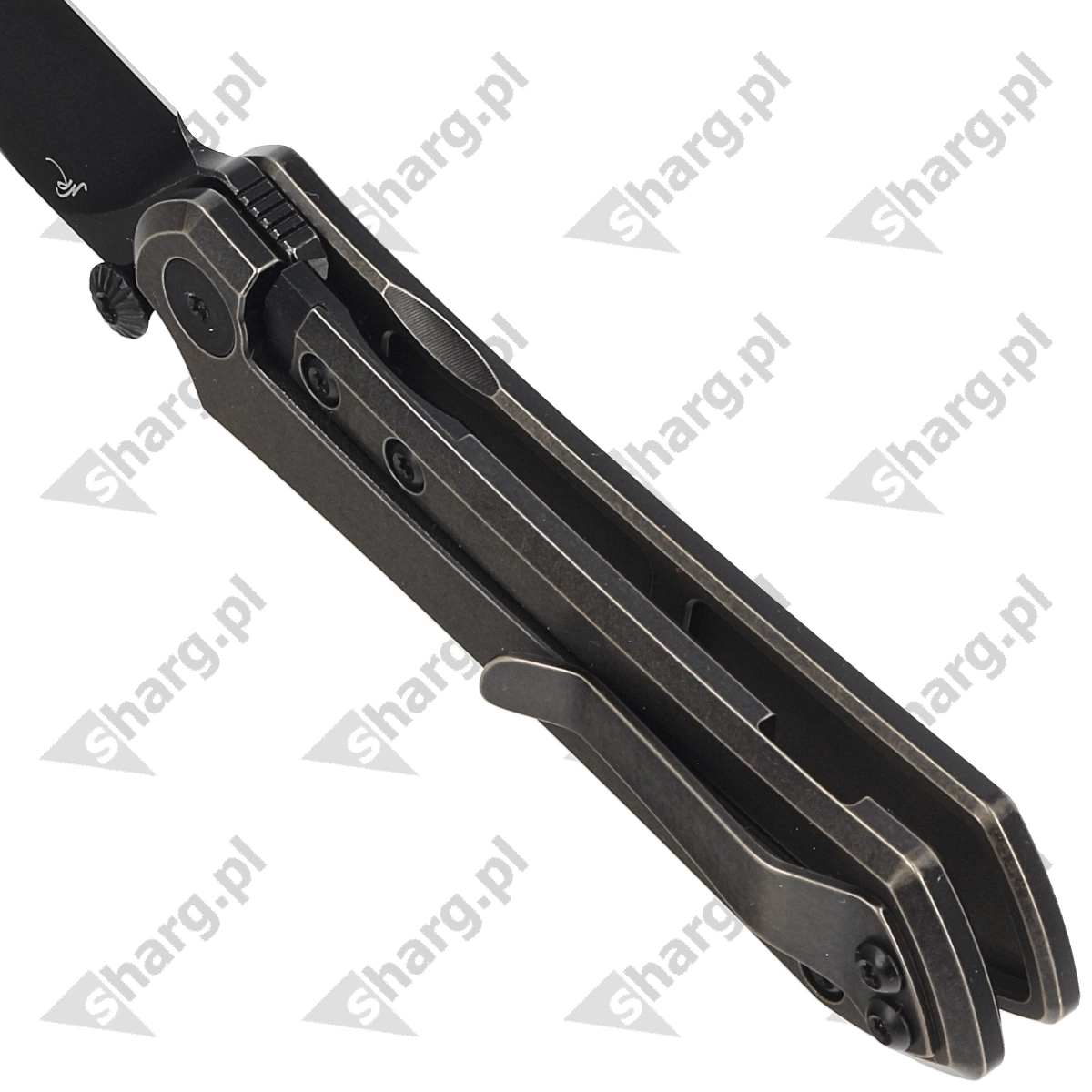 Handle - is two pieces of solid titanium 6AL4V finished in Black Stonewashed method with striking abrasions on the edges, from under which the bronze finish shines through. Ergonomically profiled, they eliminate sharp edges for comfort, notches made in the grips improve grip security. Open-backed design without the typical backspacer, fastened together with steel spacer sleeves for easy cleaning. A single-position, right-handed titanium clip allows you to carry the knife in tip-up position, with the tip of the blade upwards.