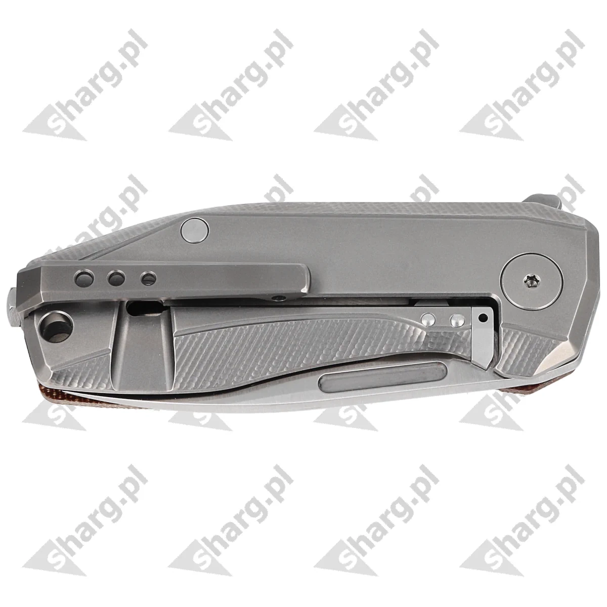 Handle - the presentation side is made of Canvas Micarta, the locking side is made of titanium 6AL4 liners screwed to a CNC-milled titanium backspacer, which means that such a design is virtually indestructible. Chamfering of the cover eliminates sharp edges for comfort, and a fore finger groove made on the front improves grip security. A two-position (right/left) titanium deep clip allows you to carry the knife discreetly in tip-up (tip up) position. Under the clip, lanyard hole, a hole for a safety or decorative cord.