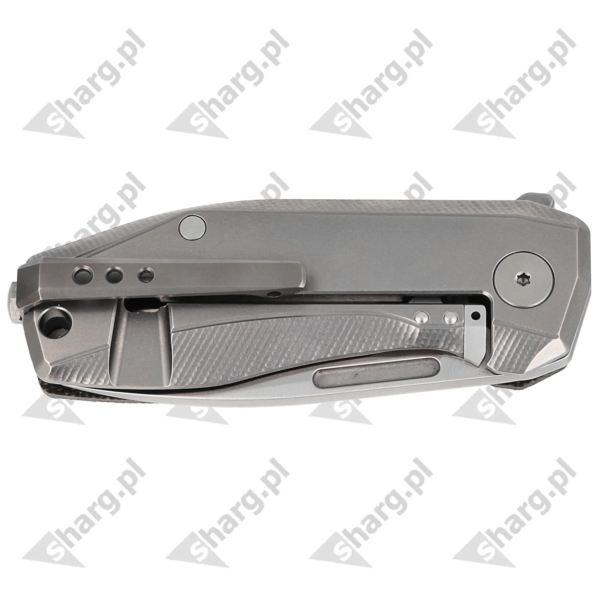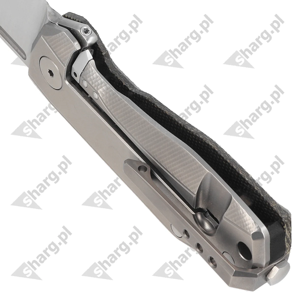 Handle - the presentation side is made of Canvas Micarta, the locking side is made of titanium 6AL4 liners screwed to a CNC-milled titanium backspacer, which means that such a design is virtually indestructible. Chamfering of the cover eliminates sharp edges for comfort, and a fore finger groove made on the front improves grip security. A two-position (right/left) titanium deep clip allows you to carry the knife discreetly in tip-up (tip up) position. Under the clip, lanyard hole, a hole for a safety or decorative cord.