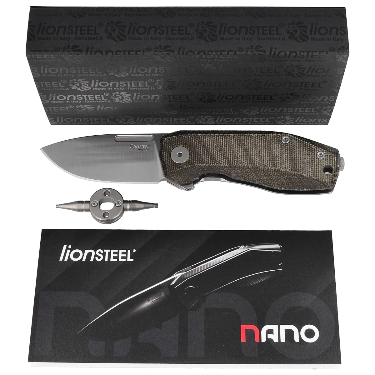 LionSteel Nano Knife Green Canvas Micarta, Satin MagnaCut (NA01 CVG)