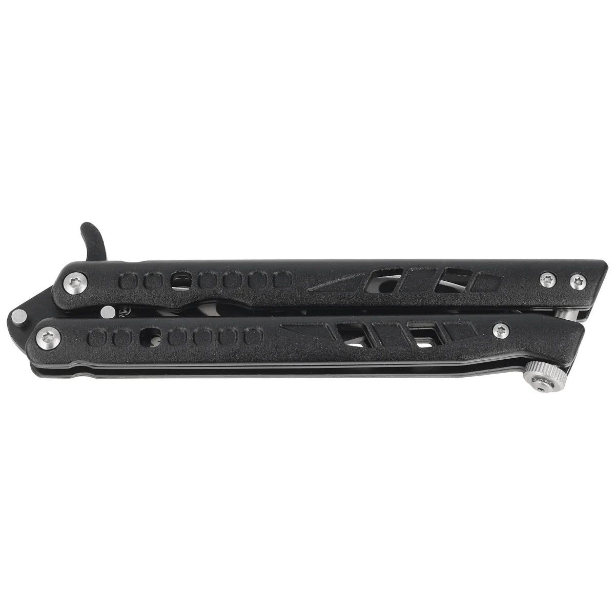 Flamas Black Aluminium, Black (Single Edge), a sturdy butterfly type folding knife from the Spanish company Martinez Albainox. Black coated aluminium handle arms, blade with single edge.