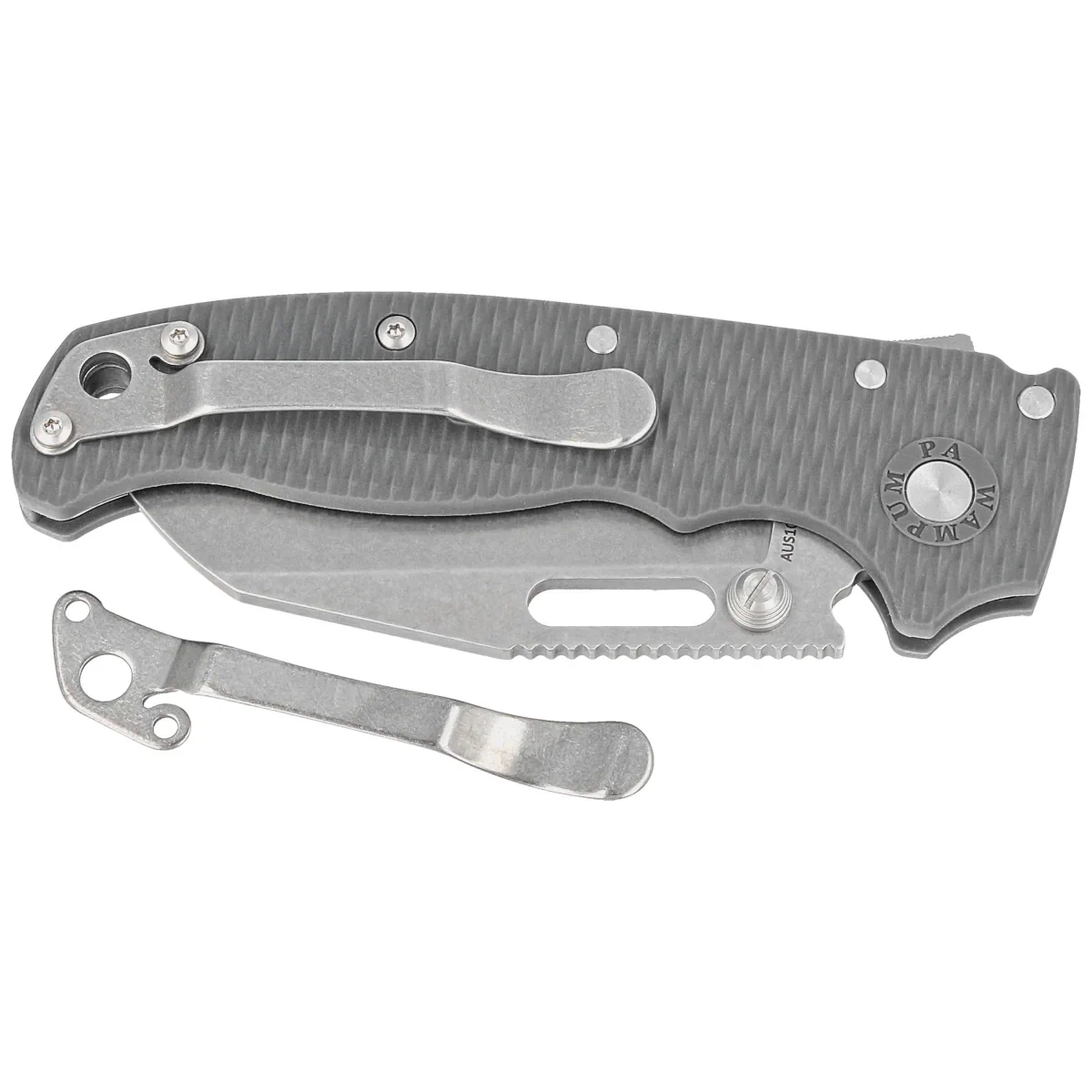 Handle grips made of Grivory, a practically indestructible material that is insensitive to weather conditions, resistant to chemicals and mechanical damage. The chamfered edges of the covers eliminate sharp edges and the characteristic textured surface improves grip security. The single-position, right-handed clip allows the knife to be carried in the tip-up position, with the tip of the blade upwards. A left-handed clip is included.