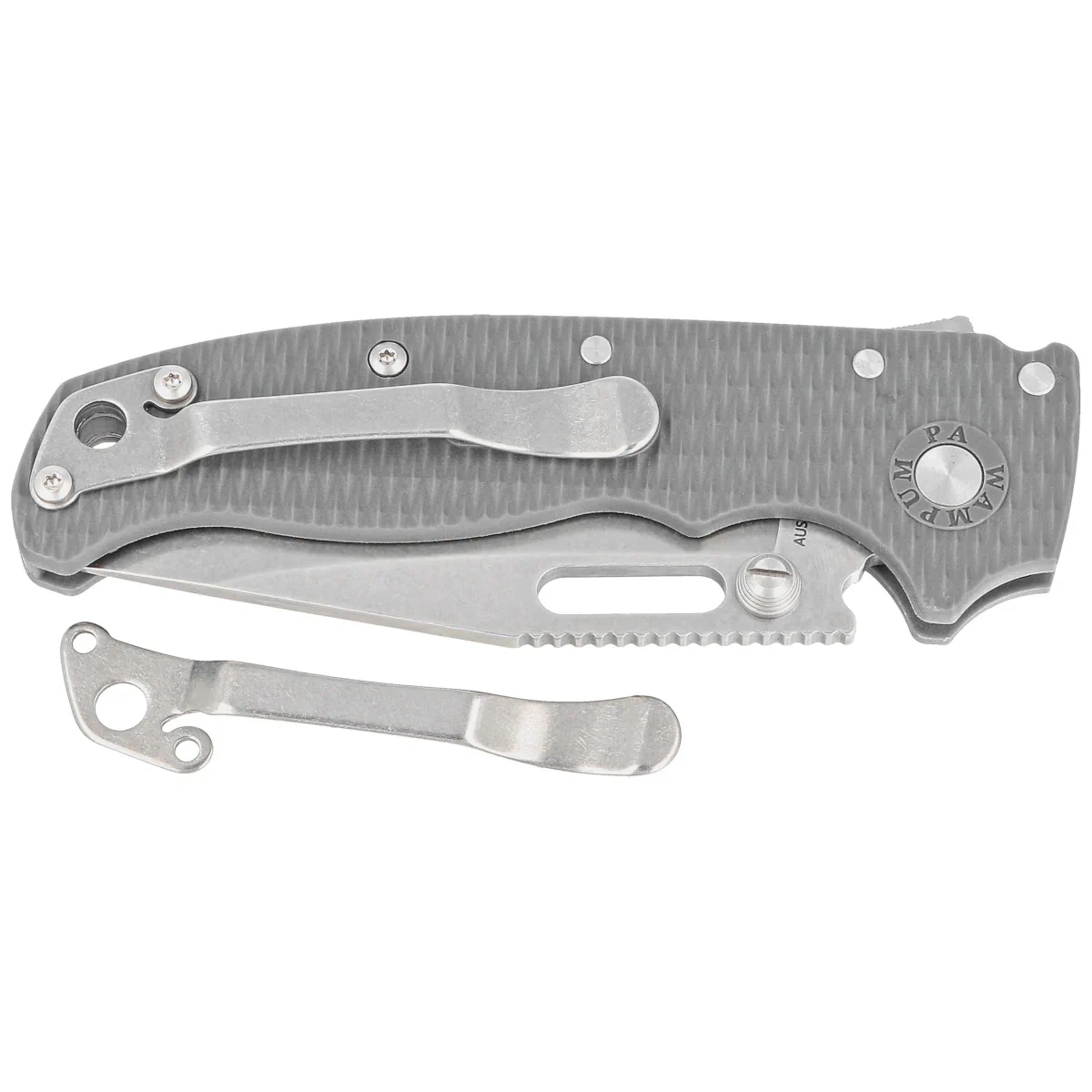 Handle - grips made of Grivory, a virtually indestructible plastic that is insensitive to weather conditions, resistant to chemicals and mechanical damage. Chamfered edges of the covers eliminate sharp edges and characteristic surface texturing improves grip confidence. A single-position, right-handed clip allows the knife to be carried in the tip-up position, with the tip of the blade upward. A left-handed clip is included.