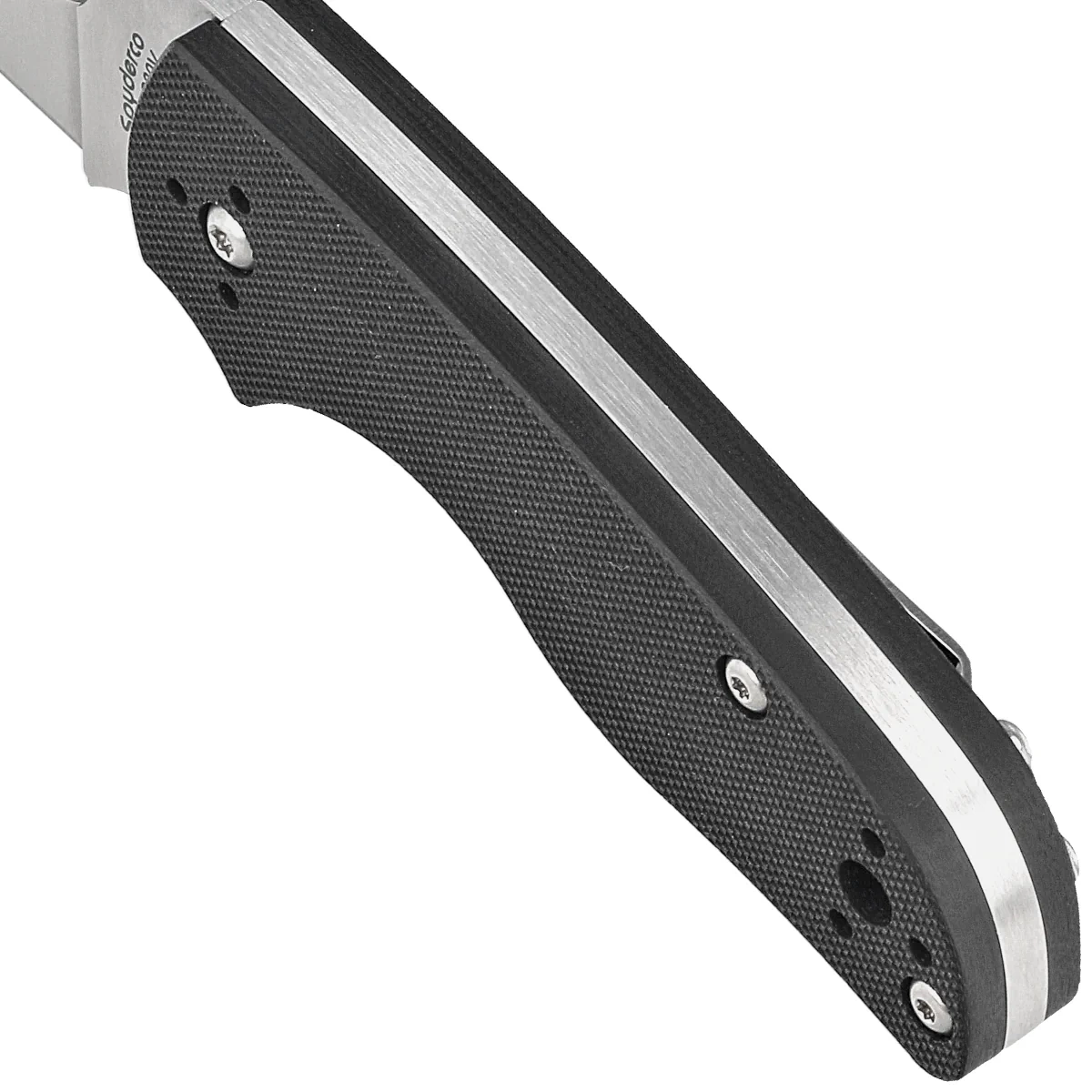 Handle - profiled, covered with non-slip textured grips made of durable, heat- and cold-resistant, chemical-resistant G-10 plastic. Handle, despite its compact size, provides full grip and excellent control, with four fingers as in full-size folders. Metal hourglass clip with four-way (up/down, right/left) 4-way clip positions. In the rear part an enlarged hole (lanyard hole) for the cord.