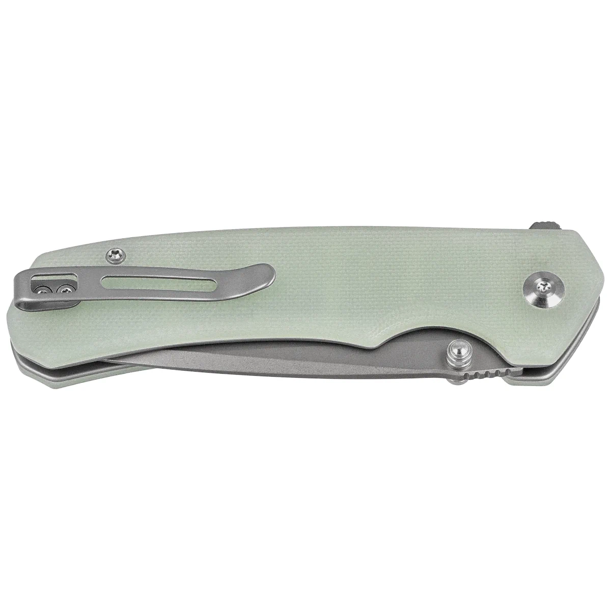 Handle - G10 grips (fibreglass compressed with synthetic resin) with a distinctive surface texture, which have been screwed to steel liners. Contoured covers eliminate sharp edges for comfort and sure grip. The open-backed design, fixed with steel spacer sleeves, reduces weight and facilitates cleaning. The pivot is decorated with a stylised Civivi brand logo. The two-position, right/left deep carry clip allows the knife to be carried discreetly in the pocket in the tip-up position (blade tip up).