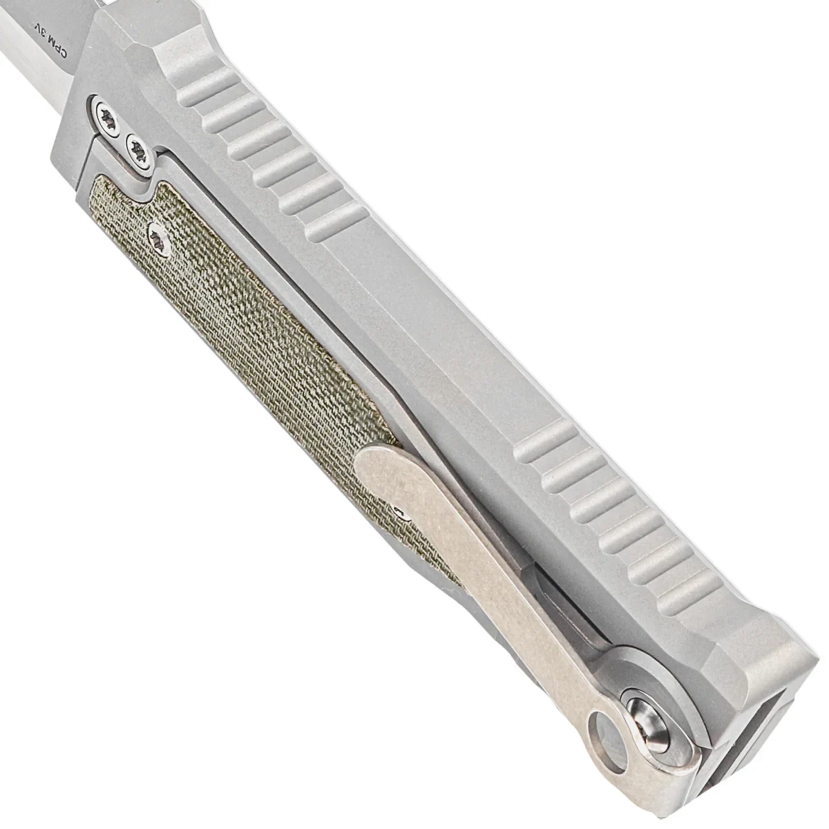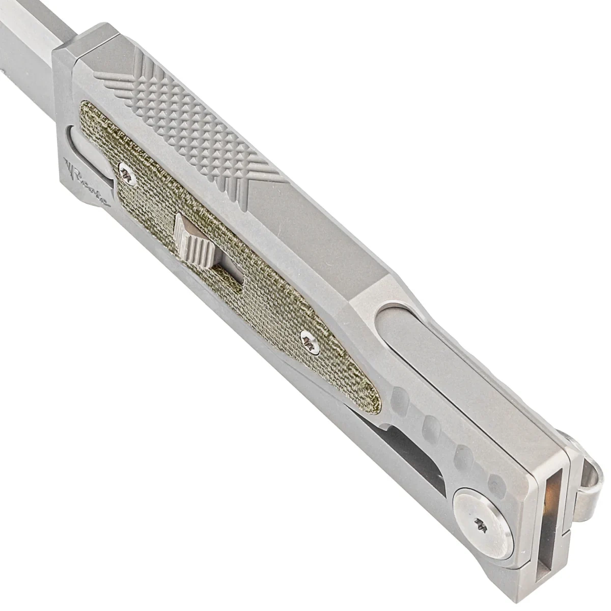 Handle - CNC-milled titanium Exoskeleton, an external skeleton with a movable top section responsible for opening and closing the knife. The chamfered edges of the sheaths eliminate sharp edges, while the perfectly matched green micarta inserts add an exclusive touch and improve grip security. On the right side, an artful sliding lock slider for advancing/retracting the blade. Once it is moved to the secure "lock" position, the knife will not be opened/closed by accident. A single-position titanium (right) deep-carry clip allows you to discreetly carry the knife in your pocket in the tip-down position (blade tip down).