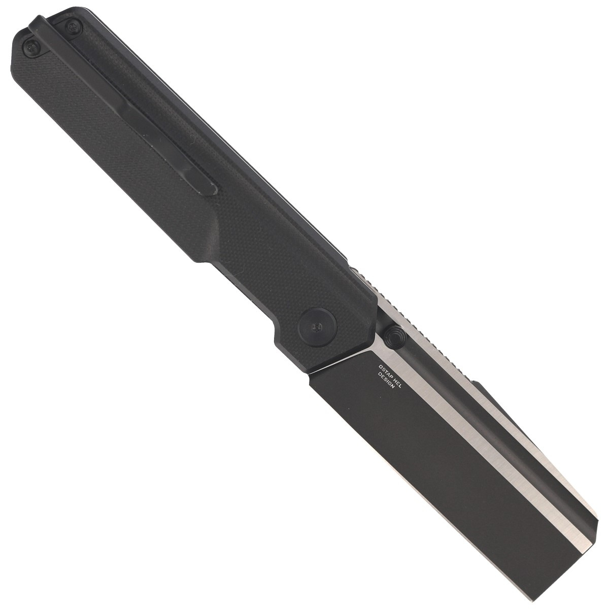 Blade - Cleaver (chopper) type with an elegant Two Tone finish, the blades are coated with black DLC coating, the rest is satin-finished. The straight line of the cutting edge converges towards the flat, safety end of the blade. The thickness of the blade, combined with the high, flat grind, gives excellent cutting edge geometry and extreme cutting performance. Ceramic ball bearings support the opening of the blade with a dual thumb stud in the wedge on both sides. A section of the back of the wedge is covered with an upper jimping, notched thumb rest for easy control of the knife. The whole thing is locked with the proven and popular liner lock.