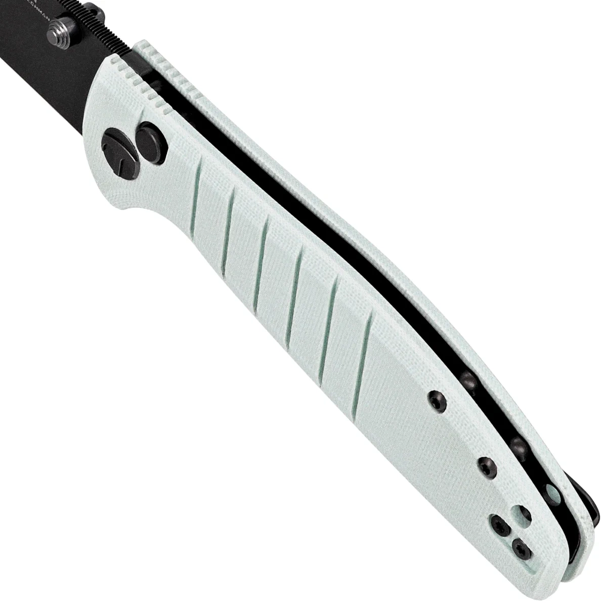 Handle - made of G10, a composite fiberglass material compressed with synthetic resin. The aggressive texture of the grips provides a firm grip, even with wet hands. The cover's chamfered edges eliminate sharp edges for comfort, and the finger indentation made on the front improves ergonomics. The open-backed design fixed with steel spacer sleeves reduces weight and makes cleaning easier. A two-position right/left deep carry clip allows you to carry the knife discreetly in your pocket in tip-up position (blade tip up).