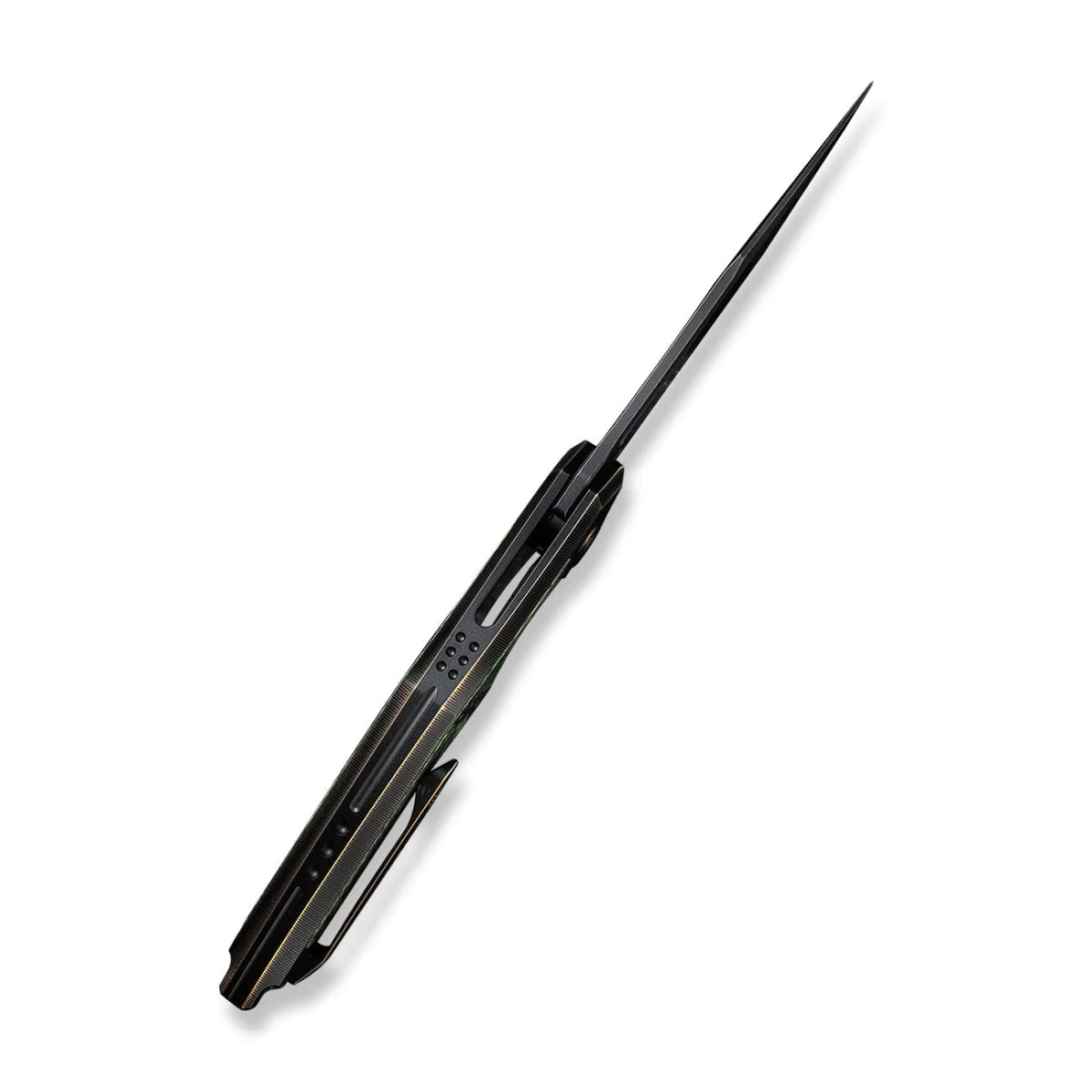 Handle - made of black 6AL4V titanium with gold accents, Fat Carbon Jungle Wear's artful inlays contrast beautifully with the titanium. Contouring of the covers eliminates sharp edges. The grips are joined together with a titanium backspacer. The textured surface improves grip confidence. The simplicity and robustness of the design give confidence in many years of use. The single-position clip (right), made of titanium, allows the knife to be carried in tip-up position. The backspacer has a place for threading a safety or decorative cord. The decorative finish of the pivot bolt is made of flame-dyed 6AL4V titanium.