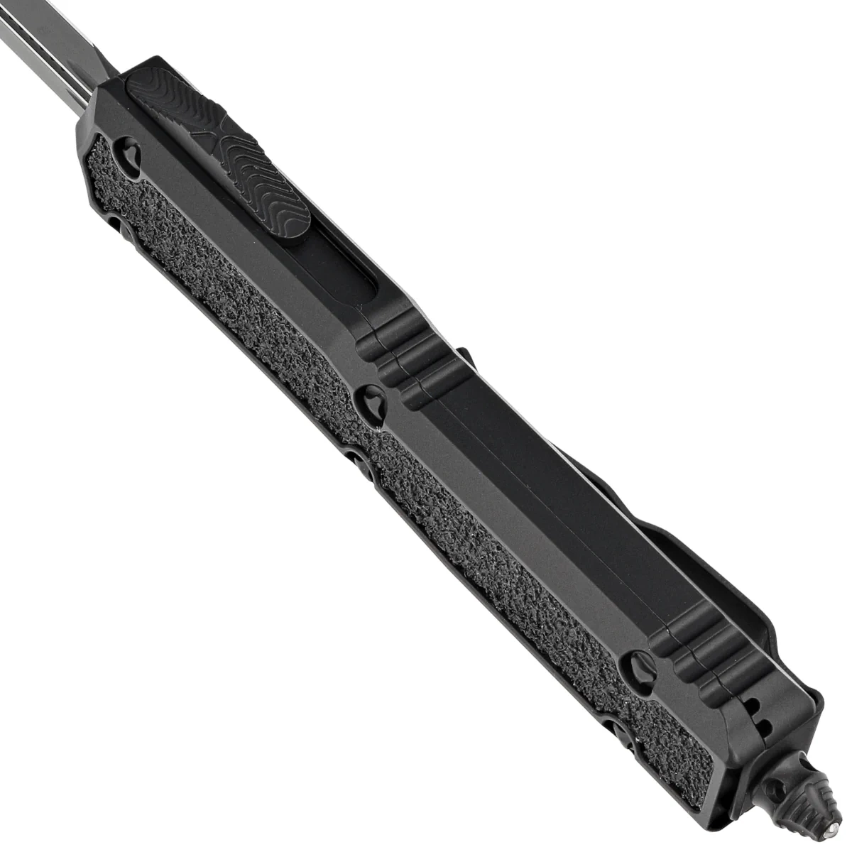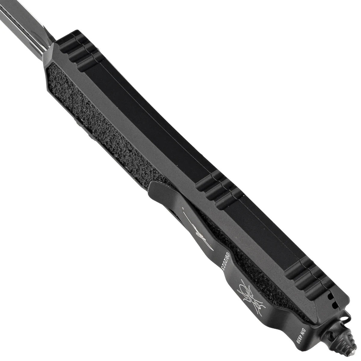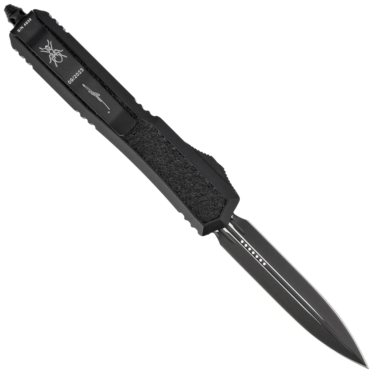 Makora Signature D/E Black DLC Aluminum/Black Inlays, Black DLC is a full-size OTF (Out The Front) automatic knife. Equipped with a hell of a fast mechanism that extends a razor sharp blade. 100% made and assembled in the USA. Designed by Anthony Marfione, knifemaker and owner of Microtech Knives.