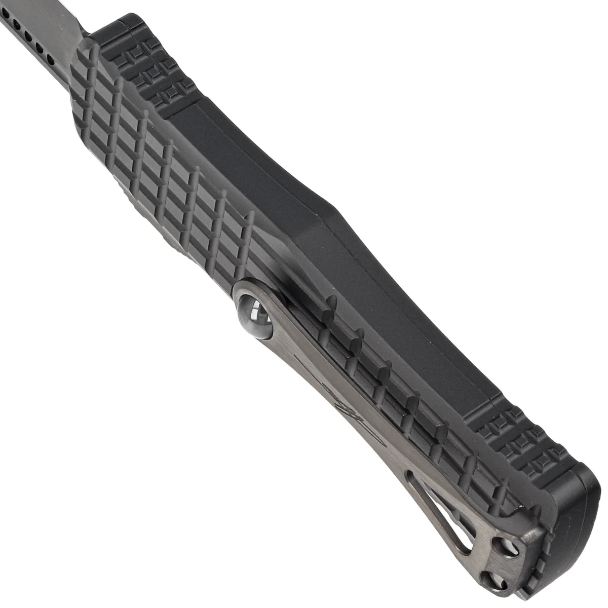 Hera S/E Frag Signature Black Aluminum Shadow, Black DLC one of the best and versatile OTF (Out The Front) automatic knives. Modeled after the iconic Troodon automatic, it is an intermediate link between EDC and tactical models. The over-the-top automatic operates in D/A (Double Action) mode using an opening mechanism that works with great force and power. This model features an excellent fit and superb finish. Designed by Anthony Marfione knifemaker and owner of Microtech Knives.