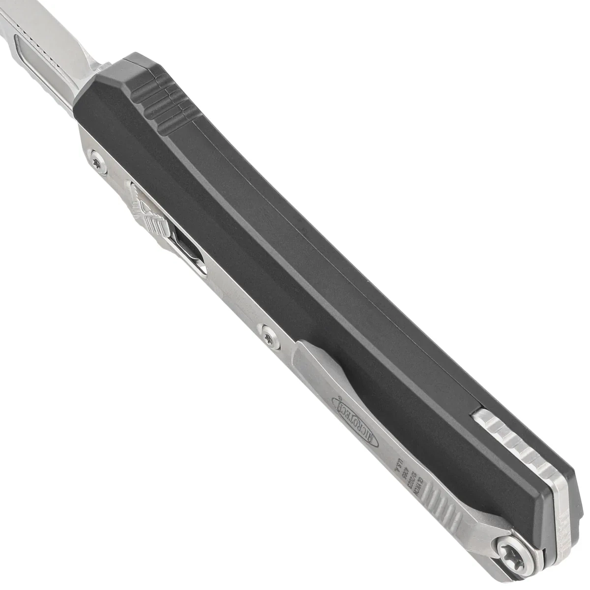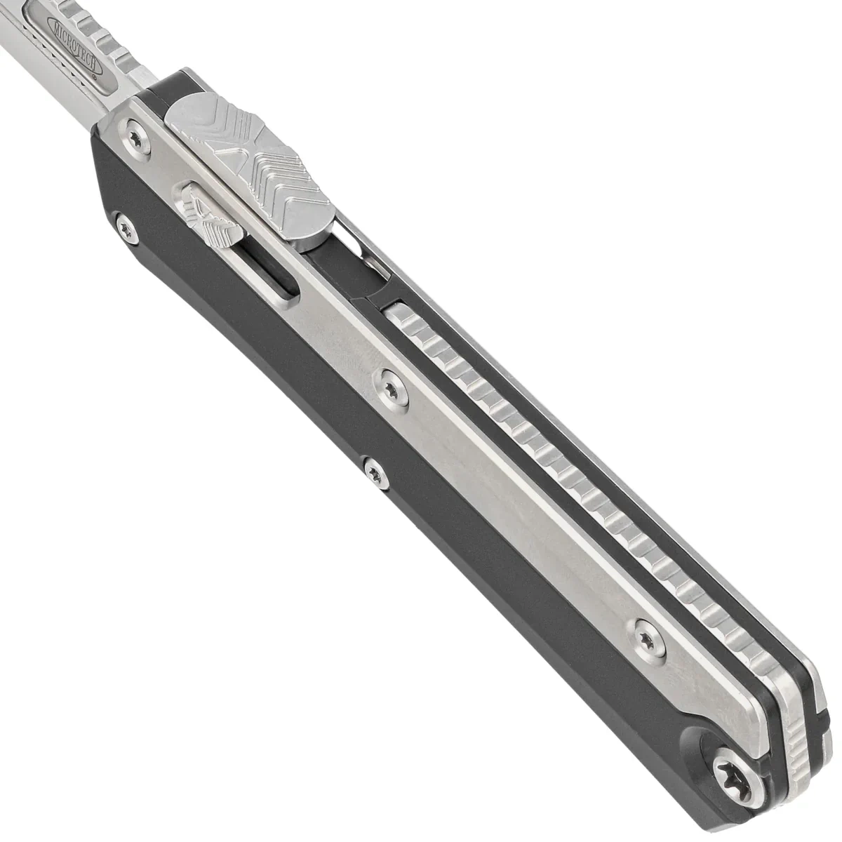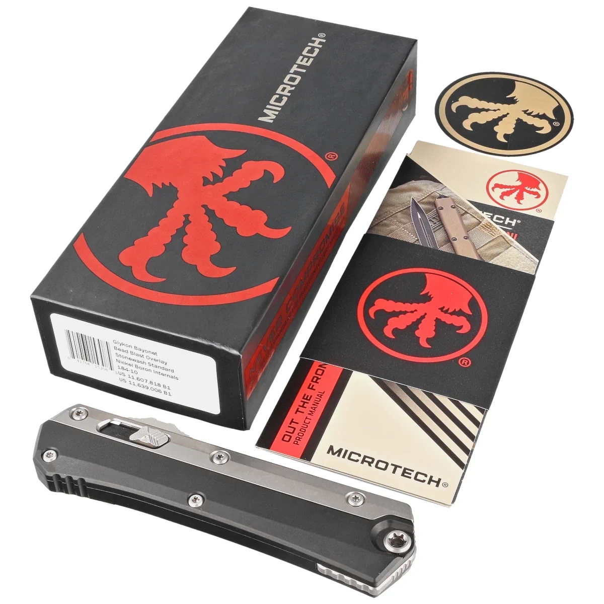 Glykon D/E Bayonet Black Aluminium / Bead Blast Titanium, Stonewashed is a large OTF (Out The Front) automatic knife from the Glykon series. The first automatic with a Tri-Sided button, allowing complete ambidextrous operation, equipped with a hell of a fast mechanism that extends the razor-sharp blade. 100% made and assembled in the USA. Designed by Anthony and Sean Marfione of Microtech Knives.