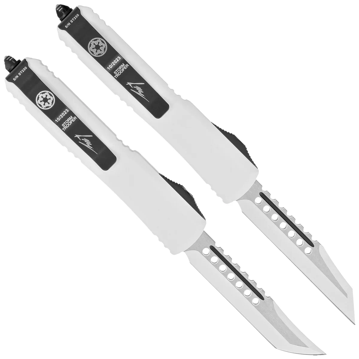 Ultratech Storm Trooper Hellhound & Warhound White, a set awarded for 25 years of service to the Empire! Only a few storm troopers have survived long enough to get one! The set includes the Ultratech S/E OTF knife Warhound and OTF knife Hellhound Signature Storm Trooper White Aluminum, White from the Signature Series line. These are full-size OTF (Out The Front) automatic knives from the Ultratech series. Operating in D/A mode, they feature a hellishly fast blade extension mechanism. 100% made and assembled in the USA. Designed by Anthony Marfione, knifemaker and owner of Microtech Knives.