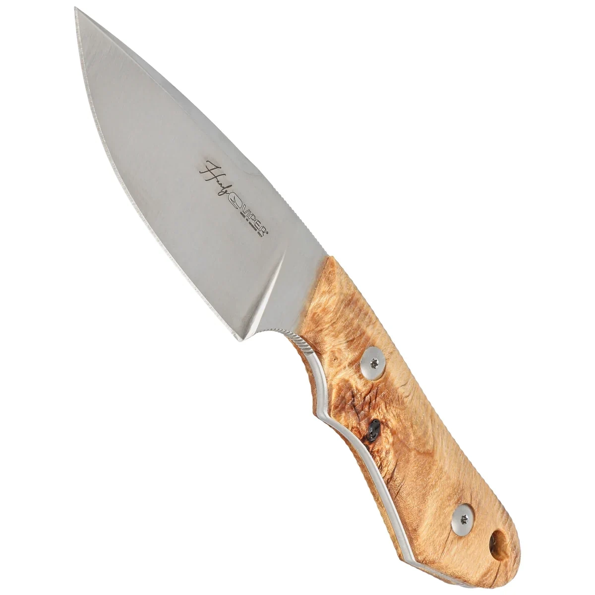 Handy Pioppo Wood, Satin versatile and perfectly balanced compact fixed blade knife designed by Fabrizio Silvestrelli. Dimensions, weight, ergonomics, this knife is designed for hunting as well as any outdoor activity. Targeted at bushcraft, survival and hunting enthusiasts.