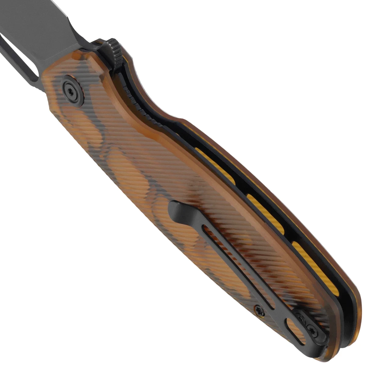 Handle - grips made of transparent Ultem™ plastic, textured to improve grip confidence, are bolted to the knife's steel frame. The open-backed design, so called, fastened together with steel spacer sleeves, reduces weight and makes cleaning easier. The simple, sturdy design gives assurance of many years of use. A deep finger undercut (fore finger groove) improves grip confidence. The pivot axis is decorated with a stylized Kubey Knife brand logo. A two-position (right/left) metal deep-carry clip allows you to carry the knife discreetly in your pocket in tip-up (blade tip up) position. Above the clip a lanyard hole, a hole for threading a safety or decorative cord.