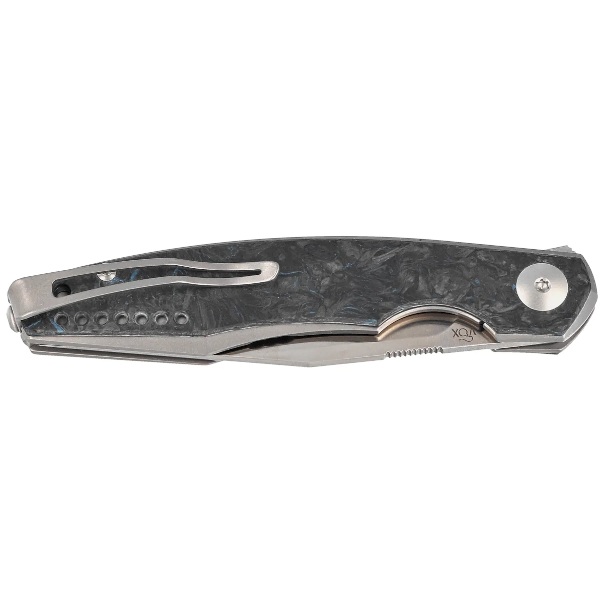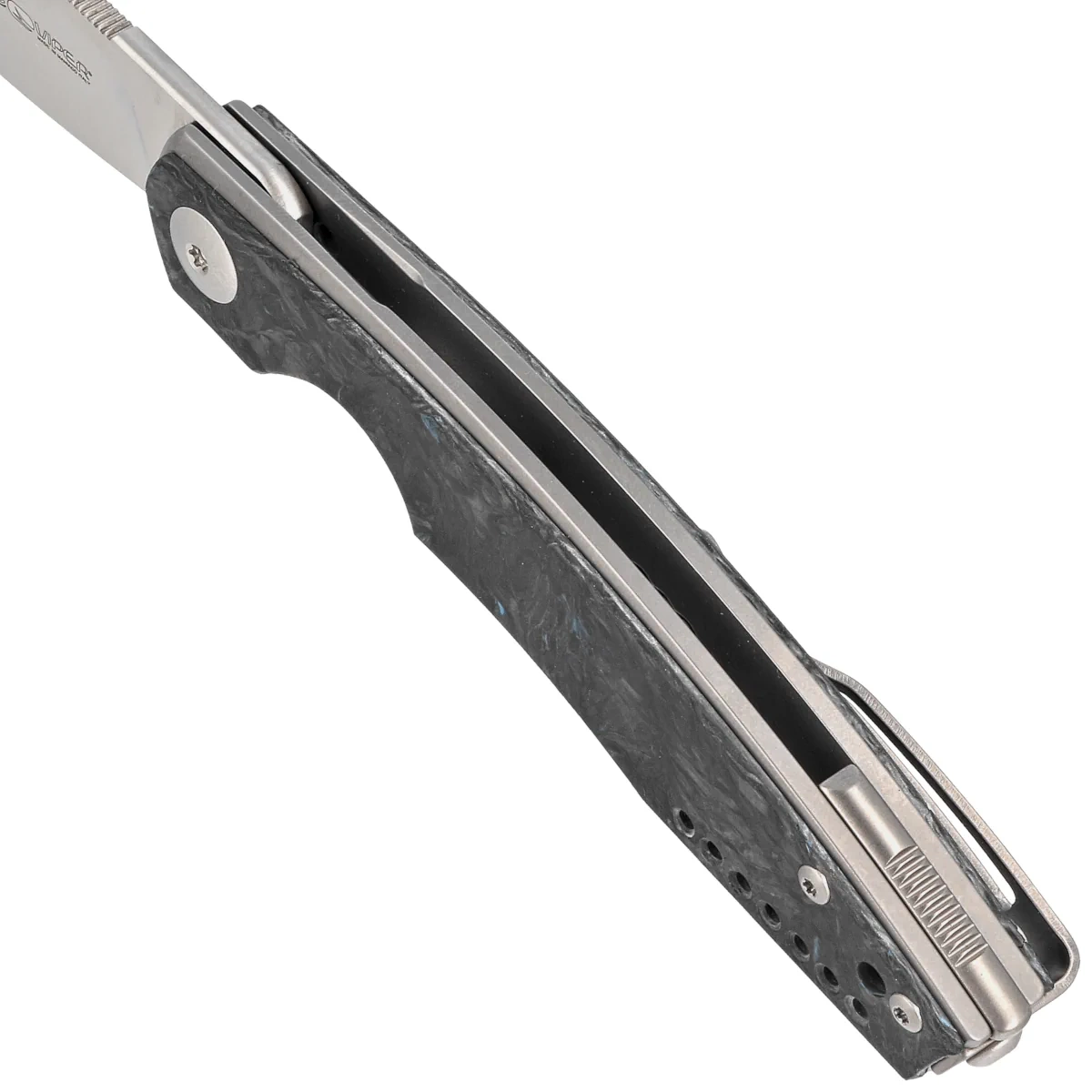 Handle - made of solid titanium 6AL4V finished stonewashed method. Contouring of the covers eliminates sharp edges. On both sides there is an overlay (overlay) made of Dark Blue Matter Carbon Fiber. The grips are joined together with a titanium backspacer. A single-position clip (right), made of titanium, allows the knife to be carried in tip-up position. Under the clip a lanyard hole, a hole for attaching a safety or decorative cord.