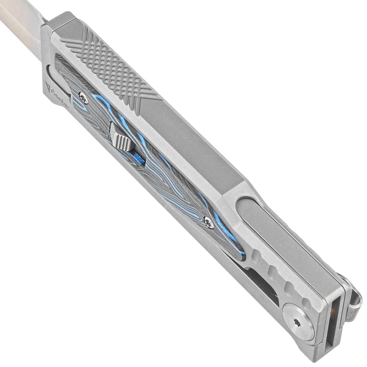 Handle – CNC-machined, titanium Exoskeleton construction. The external frame features a movable upper section responsible for opening and closing the knife. The chamfered edges of the sheaths eliminate sharp edges, and the perfectly matched G10 composite inlays in the unique Damascus pattern add an exclusive touch and improve grip security. On the right side, an artful sliding lock slider for advancing/retracting the blade. Once it is moved to the secure "lock" position, the knife will not be opened/closed by accident. A single-position titanium deep-carry clip (right side) allows discreet pocket carry in a tip-down orientation (blade tip pointing down).
