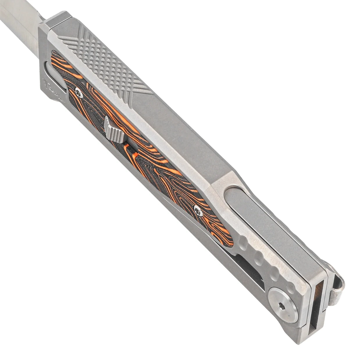 EXO-M Gravity D/E Bead Blasted Titanium/Damascus Orange-Black G10, Satin is an intuitively opened, inventive EXO-M (Medium) folding knife from the legendary Reate Knives manufactory - a true showcase of engineering excellence in design. The EXO-M model features a front-deploying blade activated by the force of gravity. The construction is inspired by the Luftwaffe aviation gravity knife, commonly referred to as the German paratrooper knife. Intuitive one-handed blade deployment and retraction, driven by gravity, combined with the use of top-grade materials, result in a knife of unmatched quality characteristic of the Reate brand.