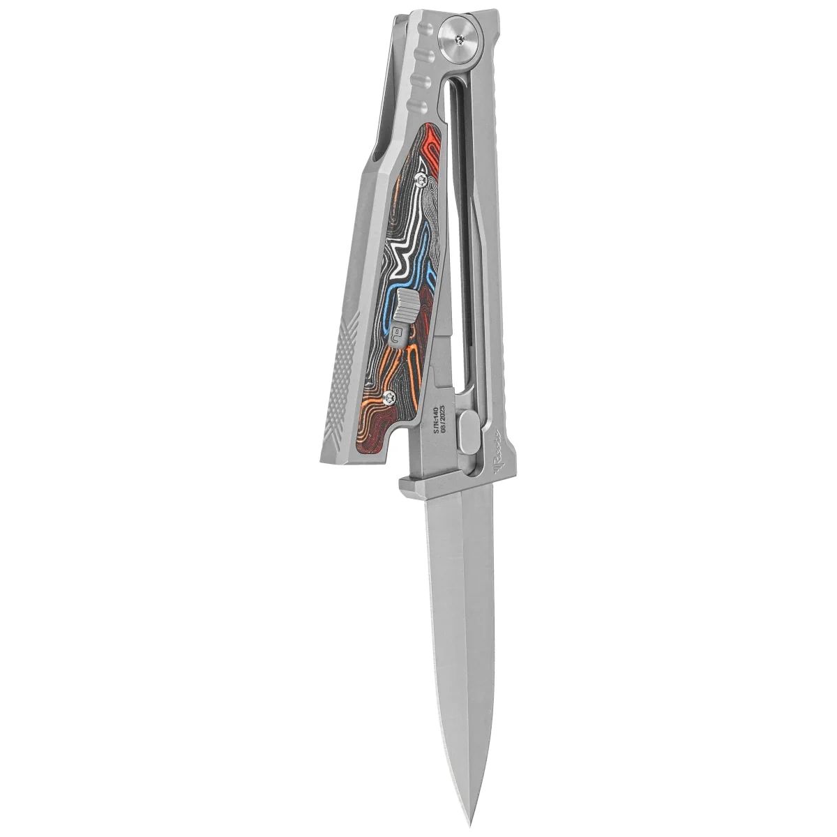 Handle - CNC-milled titanium Exoskeleton, an external skeleton with a movable top section responsible for opening and closing the knife. The chamfered edges of the sheaths eliminate sharp edges, and the perfectly matched G10 composite inlays in the unique Damascus pattern add an exclusive touch and improve grip security. On the right side, an artful sliding lock slider for advancing/retracting the blade. Once it is moved to the secure "lock" position, the knife will not be opened/closed by accident. A single-position titanium (right) deep-carry clip allows you to discreetly carry the knife in your pocket in tip-down position (blade tip down).