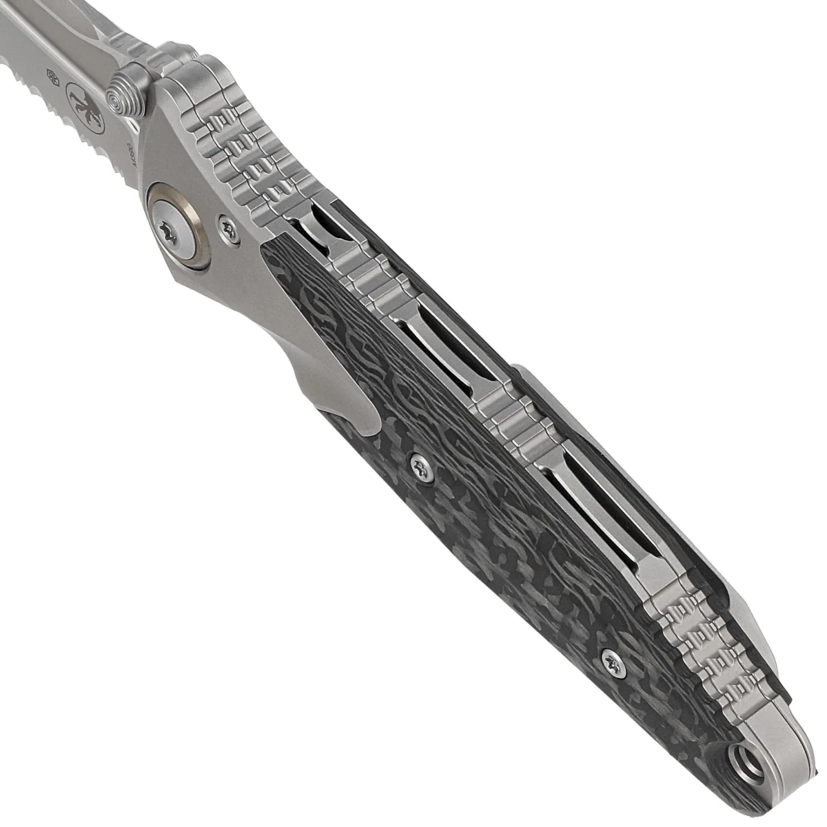 Handle - made with perfect precision in 3D technology on CNC milling machines from titanium. Perfectly fitted inlays (inlay) of Carbon Fiber composite make the knife does not slip in the hand during use. There are notches (jimping) on the back of the Handle for a more secure grip. The ergonomic profile and milled single-position (right) solid clip, allow the knife to be carried discreetly in the pocket, in tip-up(blade tip up) position. The pivot axis is decorated with a bronze-colored rim (pivot collar cap). In the back there is a lanyard hole, a place for a safety or decorative cord. A protruding piece of titanium frame can be used as an improvised glass breaker.