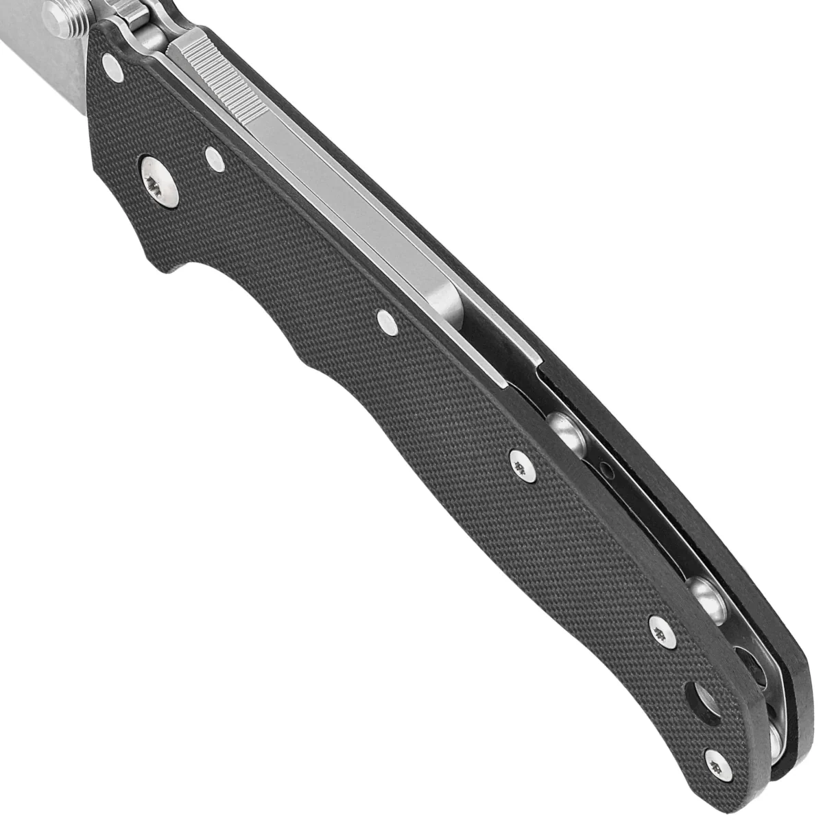 Shark-Lock™ mechanism is located on the back of the knife and is operated by a ramp-like "flipper". Opening the blade causes the spring-driven locking arm to move up and then into a notch in the shank, placing it under the locking pin. Uniquely, the locking mechanism moves forward and backward while simultaneously moving up and down. This allows for an increase in the size of the blade contact area, providing better mechanical strength in a specific area. And since the drive spring that moves the locking element upward to the locked position is located in the locking arm itself, it will not be exposed to dirt and debris.