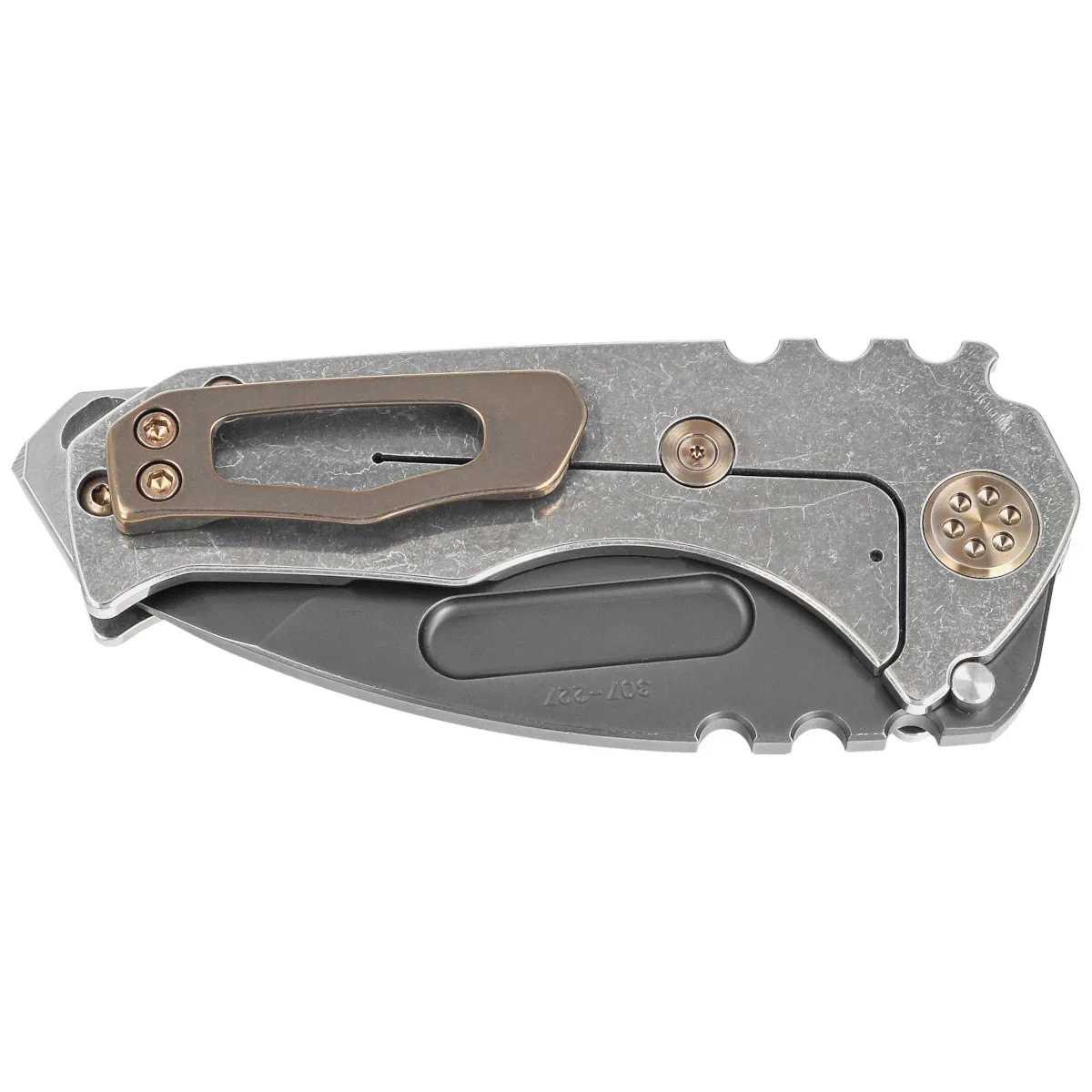 The elite Imperial Praetorian Guard was a unit into which the best of the Roman legionaries were selected to serve as the Emperor's personal protection. The MKT Praetorian Genesis T Tanto, Tumbled Titanium, Bronze HW/Clip, NP3 Breaker, Black DLC is just such an elite knife. Its amazing design is limited only by the strength of its materials. With a 4.8mm thick blade, solid 3.2mm thick titanium grips and 6.35mm thick pivots and screws, it stands out from other knives. The hollow grind on the blade has been crafted by hand - a rarity in the knife industry, achieved by only a select few manufacturers capable of executing such precision. Beautiful form and function, unrivaled reliability, this is a knife for enthusiasts who do not recognize compromise and demand the highest standards!