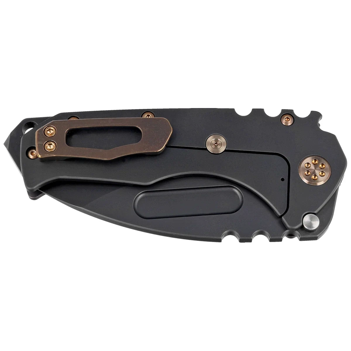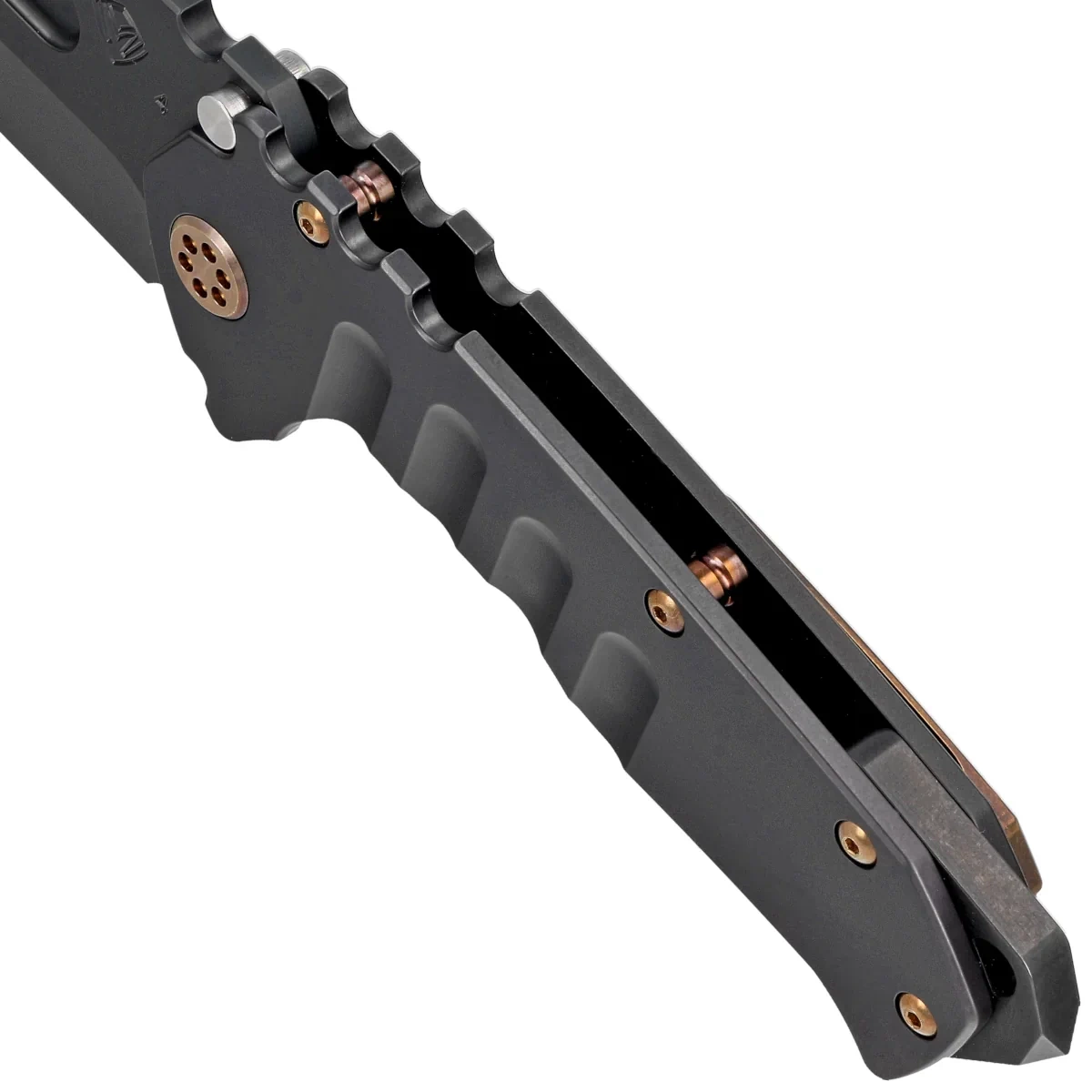 The elite Imperial Praetorian Guard was a unit into which the best of the Roman legionaries were selected to serve as the Emperor's personal protection. The Praetorian T Drop Point, Black DLC Titanium, Bronze HW/Clip, PVD Breaker, Black DLC from MKT is just such an elite knife. Its amazing design is only limited by the strength of its materials. With a 4.8 mm thick blade, solid 3.2 mm thick titanium grips and 6.35 mm thick pivots and screws, it stands out from other knives. The hollow grind on the blade has been crafted by hand - a rarity in the knife industry, achieved by only a select few manufacturers capable of executing such precision.