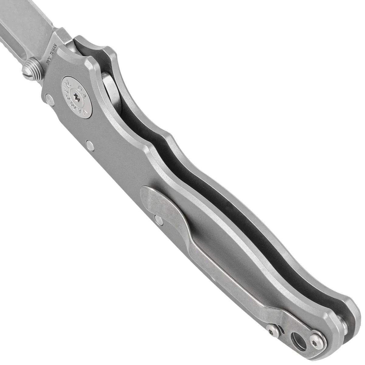 Handle - made of 6AL4V titanium with a slightly rough texture, whose chamfered edges of the covers eliminate sharp edges for comfort, and the fore finger groove made on the front improves grip security. A single-position, right-handed clip allows the knife to be carried in the tip-up position, with the tip of the blade upward. A left-handed clip is included.