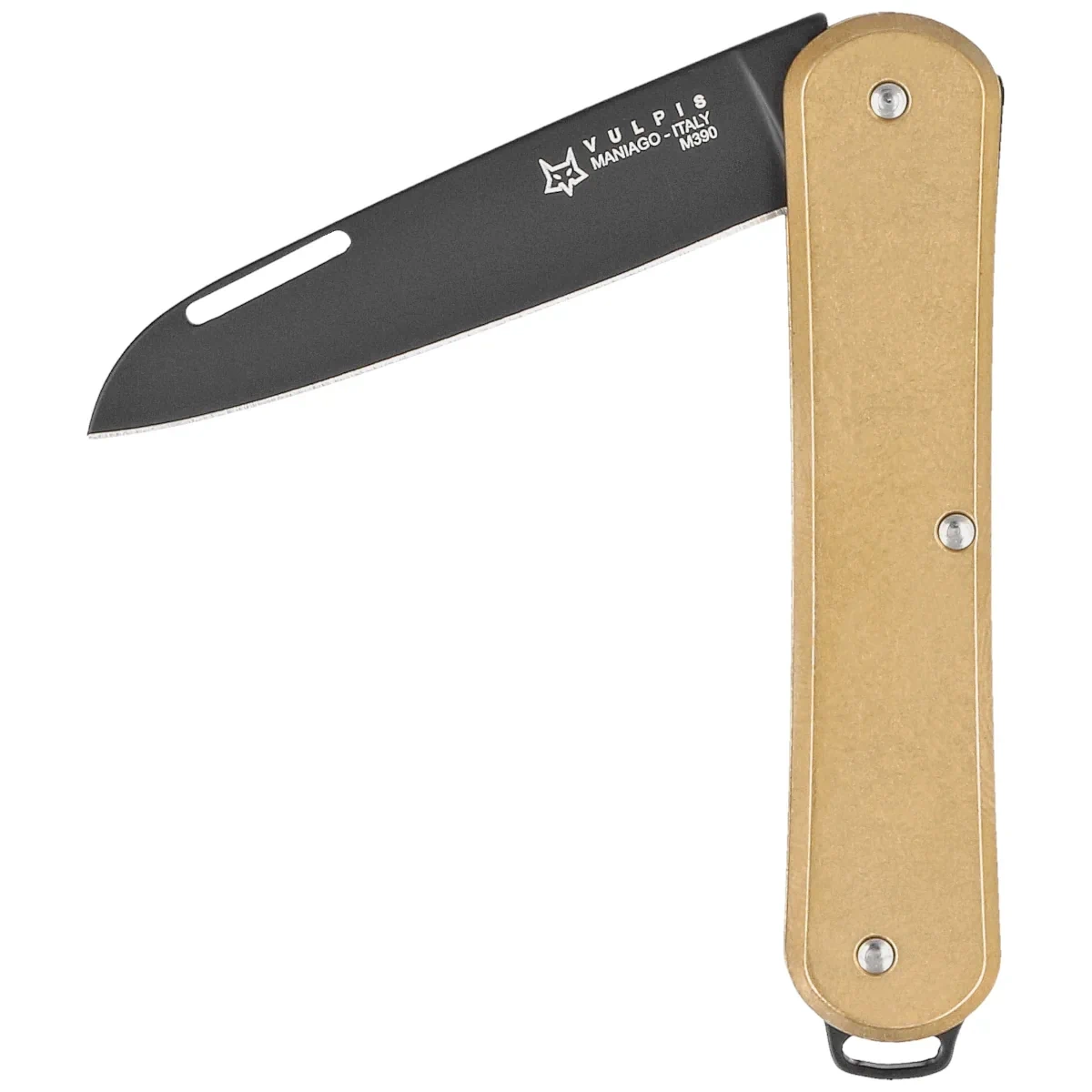 - Vulpis Brass, Black Top Shield, if you're bored with Swiss design, try Italian elegance! The new Fox Knives Vulpis series wants you to not give up good steel in a new small and versatile multi-tool!