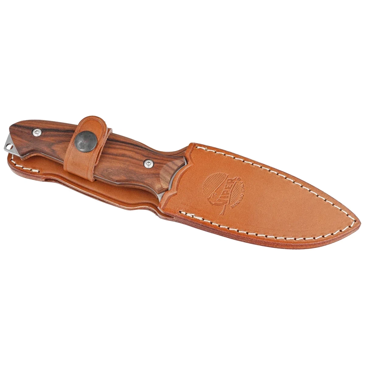 The Pointer Cocobolo Wood, Satin, designed by Tommaso Rumici, is a true masterpiece of the designer's craftsmanship and experience. Its compact size makes it extremely handy and easy to carry, making it an ideal tool for bushcraft, survival and hunting enthusiasts. Excellent ergonomics ensure a comfortable and secure grip. Not only practical, but also elegant, thanks to its Satin finish and Cocobolo wood handle. Made of high quality N690Co stainless steel, resistant to corrosion and maintains sharpness for a long time. The perfect tool for anyone who appreciates quality, functionality and elegance. Whether you are a bushcraft, survivalist, hunting enthusiast or just looking for a sturdy handheld knife, this knife is for you.