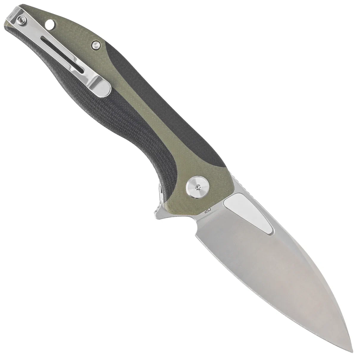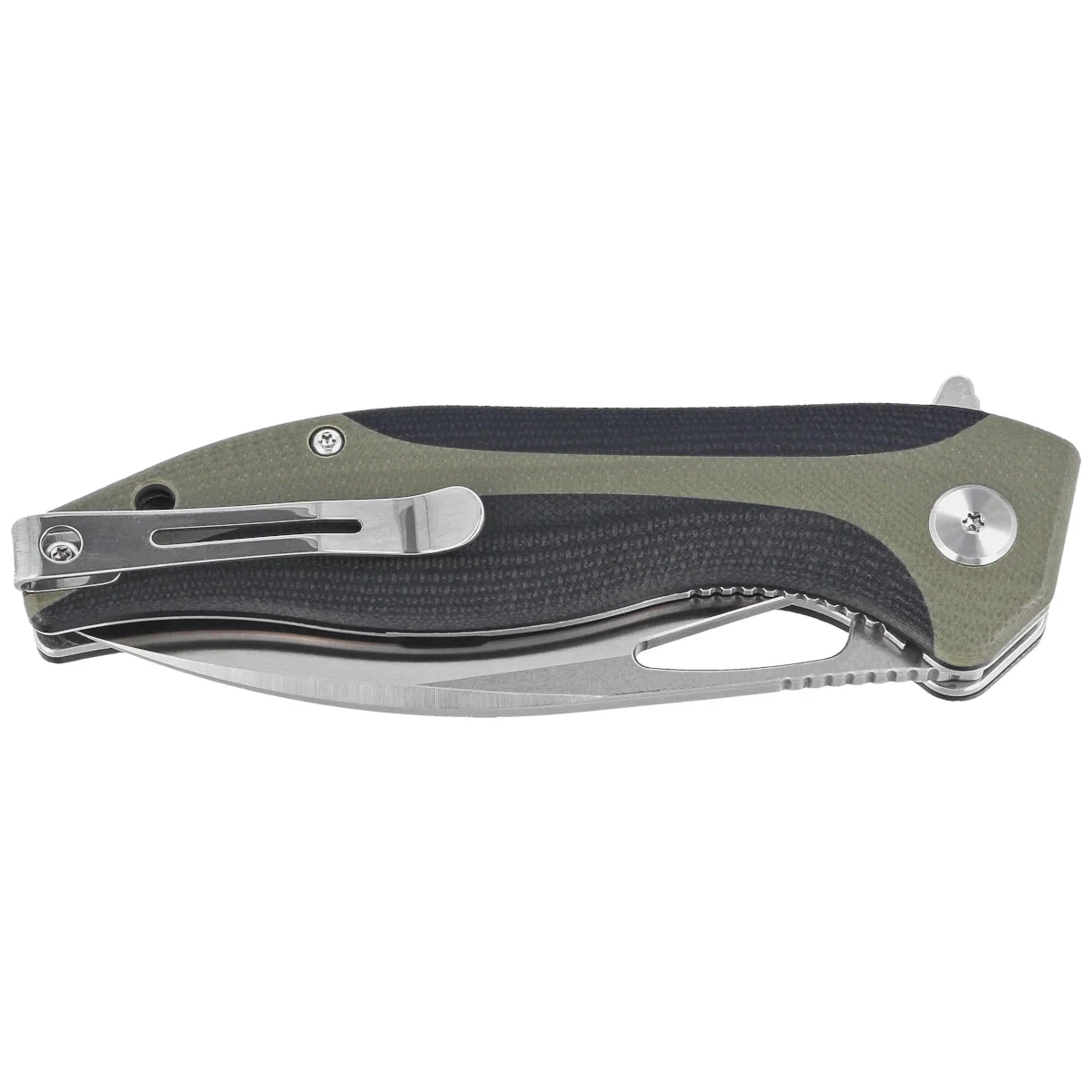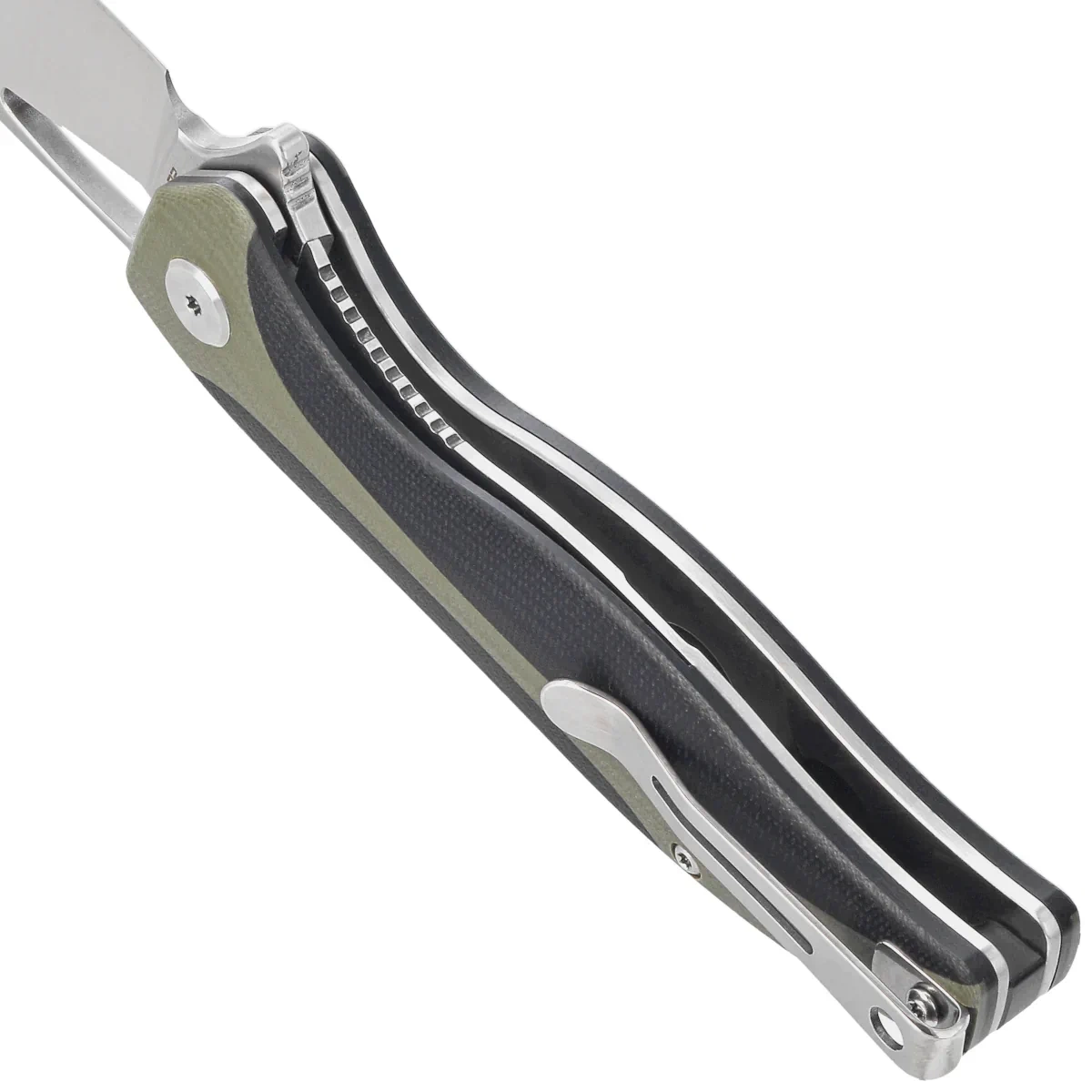 Handle grips - grips made of G10, a virtually indestructible plastic insensitive to weather conditions, resistant to chemicals and mechanical damage Chamfered edges of the covers eliminate sharp edges and characteristic texturing of the surface improves grip security. Bolted to a sturdy backspacer that provides the desired rigidity of the whole. The simple, sturdy design provides assurance of years of use. The single-position, right-handed clip allows the knife to be carried in the tip-up position, with the tip of the blade upward. Above the clip a hole for threading a safety or decorative cord.