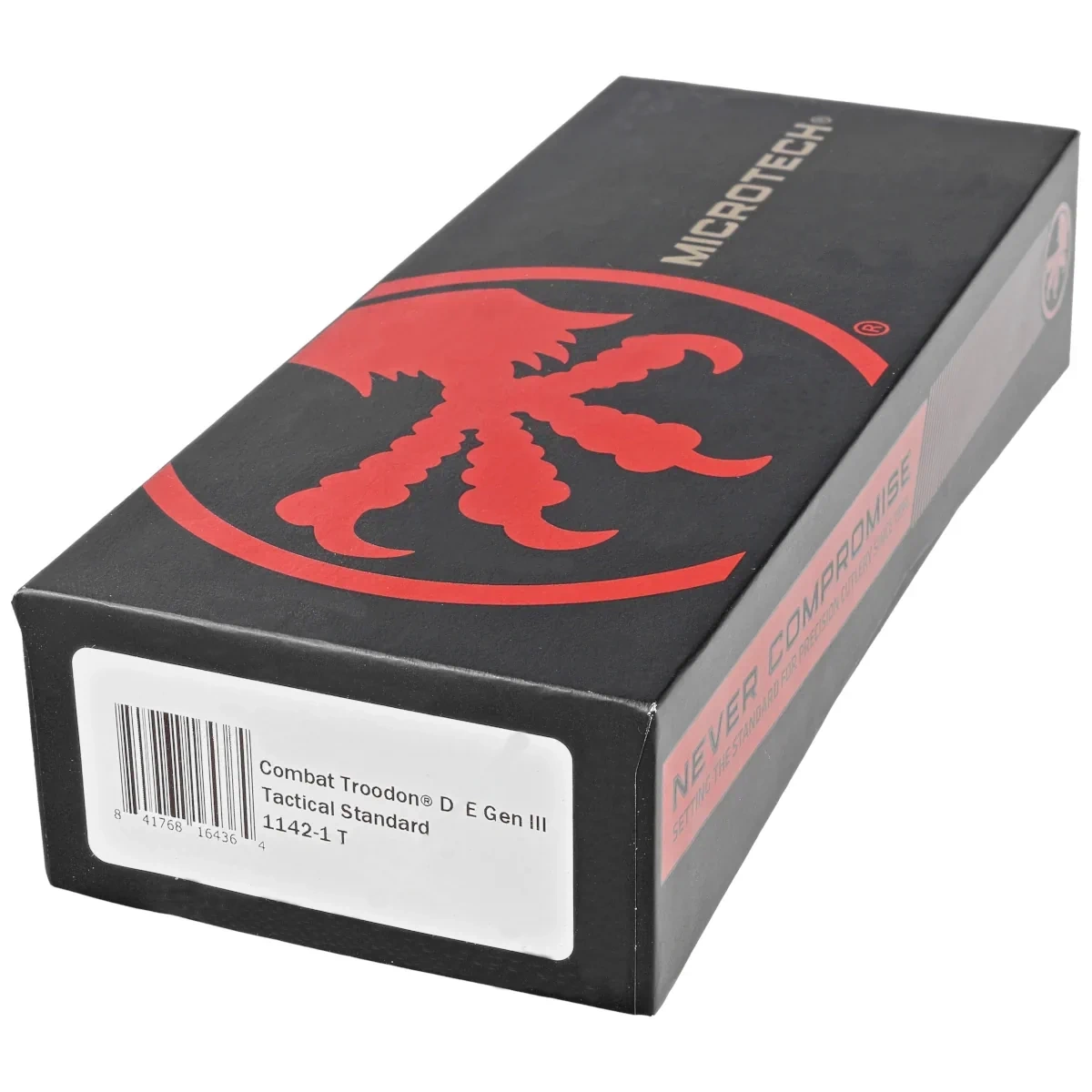 Combat Troodon Gen III D/E Black Aluminum, Tactical featuring a tactical blade finish. This largest of automatic knives represents the pinnacle of precision engineering and tactical prowess in the realm of OTF (Out The Front) knives. Designed for a wide range of utility applications, it boasts a size 25% larger than the flagship Troodon. Precisely crafted, it features a sophisticated and hellishly fast mechanism that extends the razor-sharp blade. It is 100% made and assembled in the USA. The design is by Anthony Marfione, knifemaker and owner of Microtech Knives.