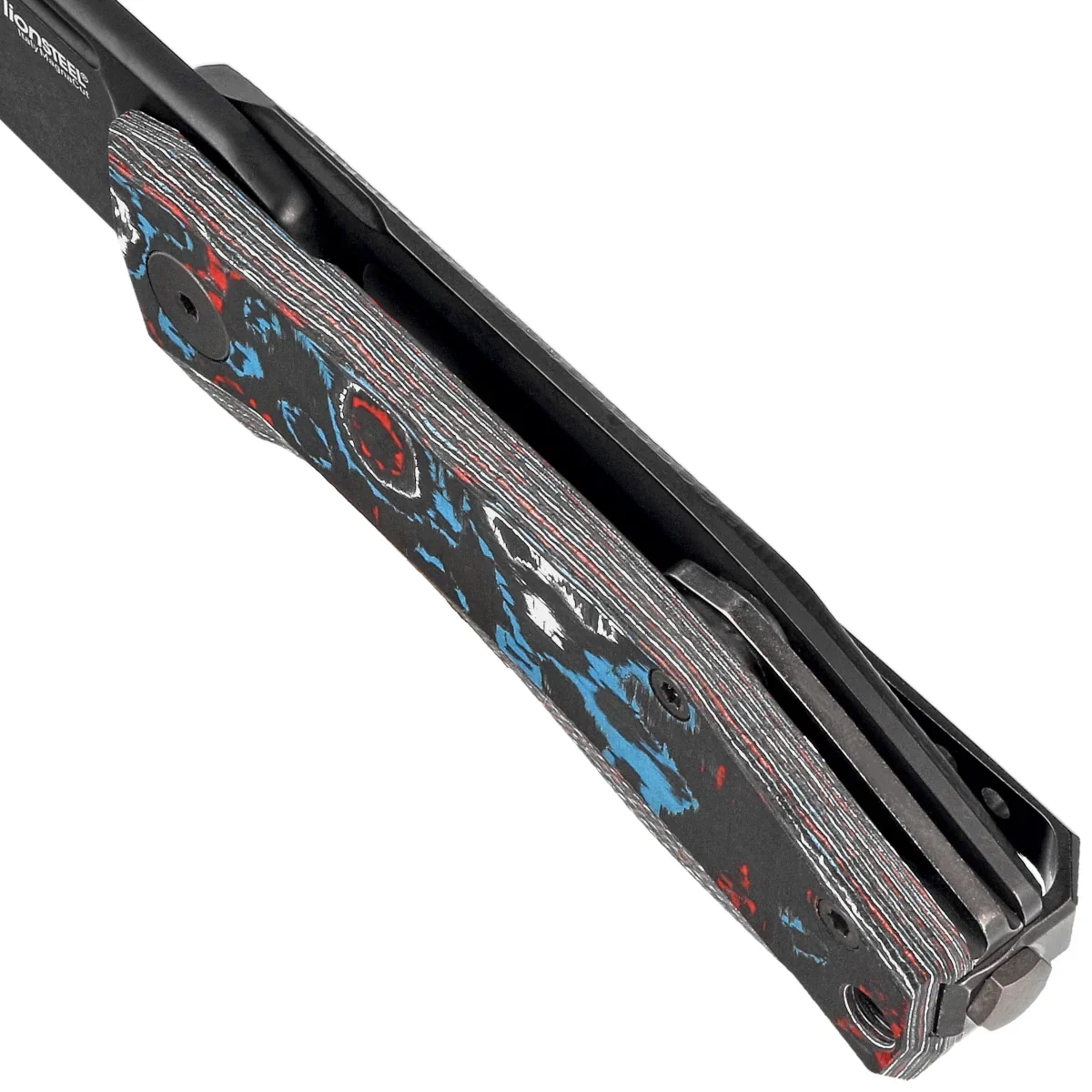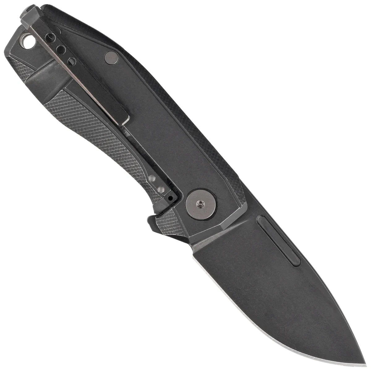 Handle - the presentation side is made of Nebula Fat Carbon, the locking side is made of solid titanium 6AI4V., the grips are screwed to a CNC-milled titanium backspacer, which provides the desired rigidity and strength of the entire structure. Chamfering of the covers eliminates sharp edges for comfort, and the fore finger groove made on the front improves grip security. A two-position (right/left) titanium deep clip allows you to carry the knife discreetly in tip-up position. Under the clip, lanyard hole, a hole for a safety or decorative cord.