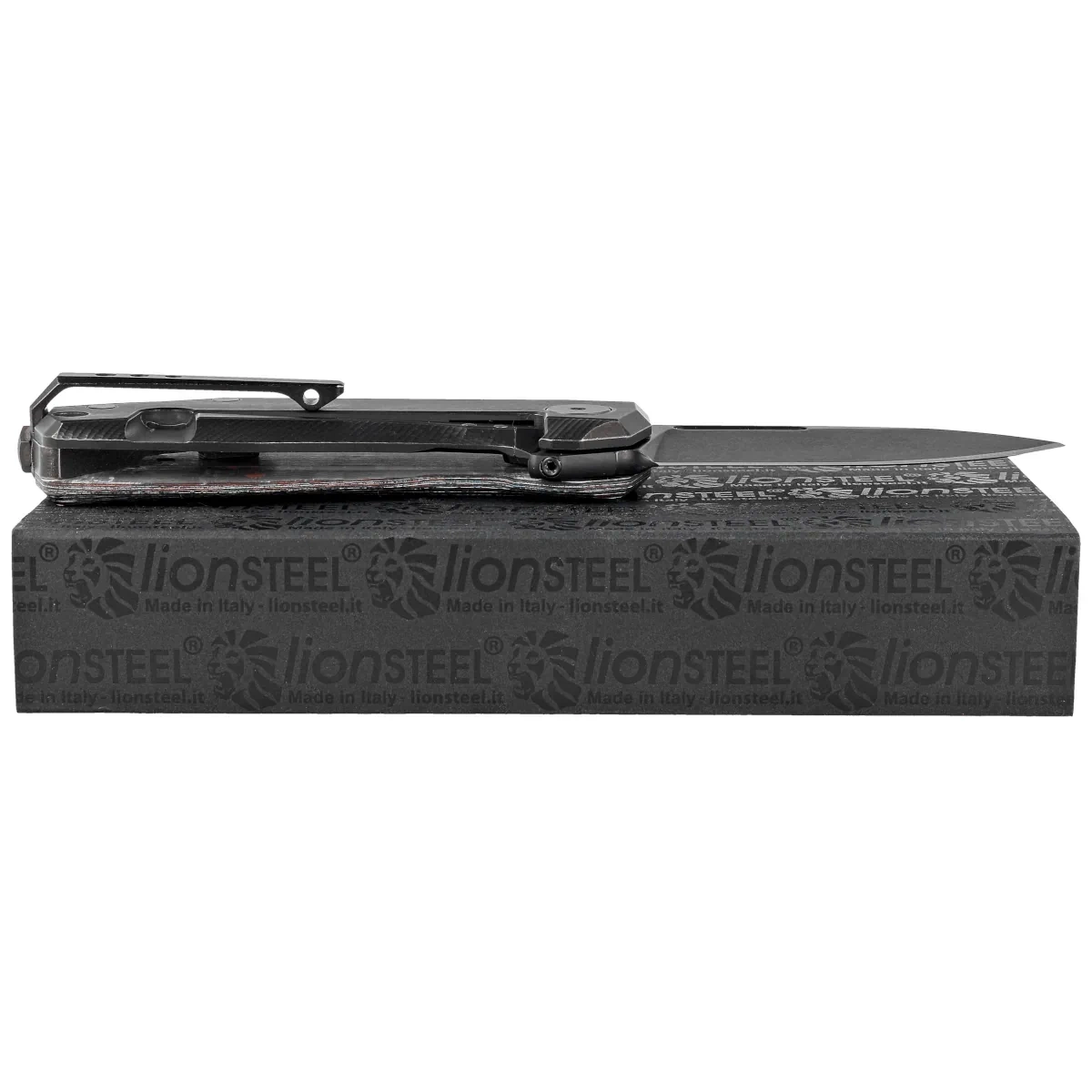 Blade - drop point type, finished with a scratch-masking bath of fine Stonewashed pebbles and then coated with a black coating, an effect LionSteel has named Old Black. The generous belly extends the length of the cutting edge relative to the length of the blade converging toward the needle-sharp tip of the knife. The thickness of the blade provides high strength while the high, flat grind guarantees excellent cutting properties almost on the level of a razor. Ceramic ball bearings support the opening of the blade with a quick index-finger flipper when opened acting as a stag. The entire blade is locked with the proven and popular frame lock with a steel inlay to prevent wiping of the lock face.