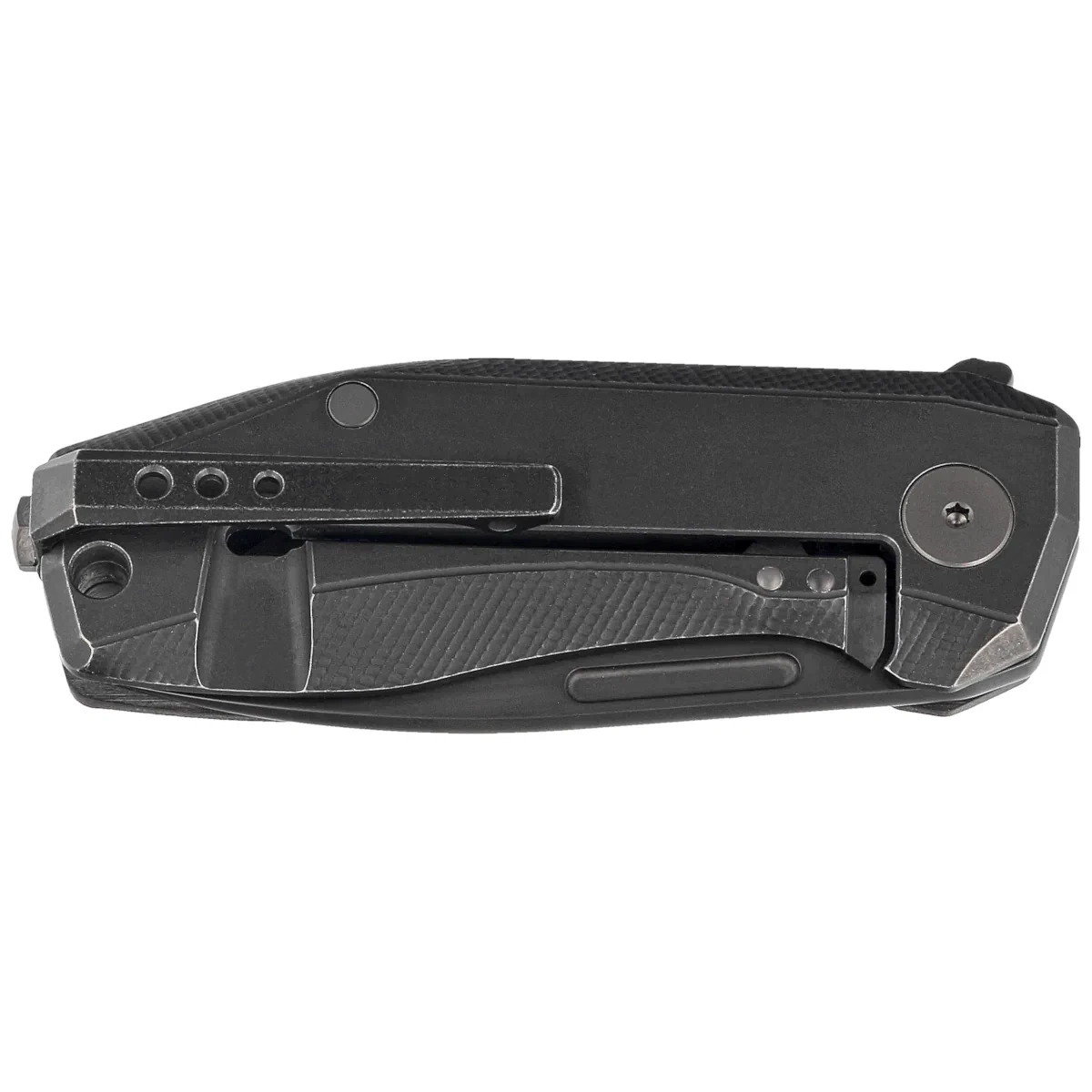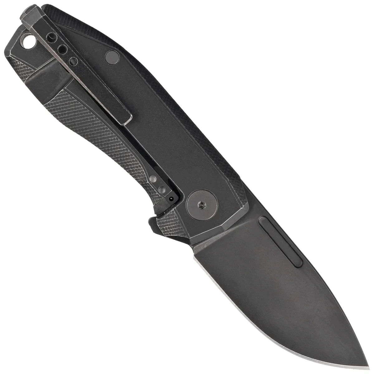 Handle - the presentation side is made of Purple Haze Fat Carbon, the locking side is made of solid titanium 6AI4V., the grips are screwed to a CNC-milled titanium backspacer, which provides the desired rigidity and strength of the entire structure. Chamfering of the covers eliminates sharp edges for comfort, and the fore finger groove made on the front improves grip security. A two-position (right/left) titanium deep clip allows you to carry the knife discreetly in tip-up position. Under the clip, lanyard hole, a hole for a safety or decorative cord.