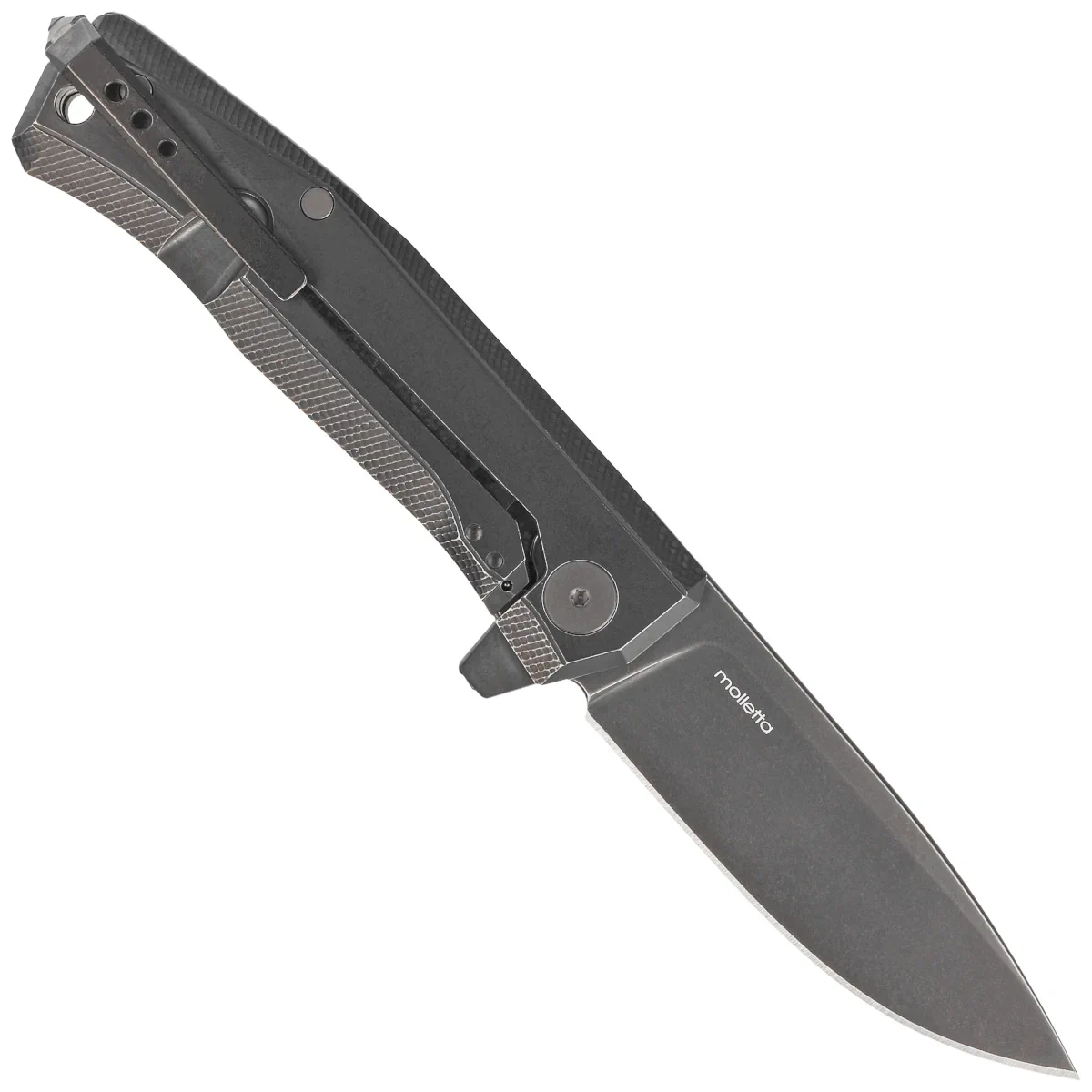 Blade - Drop Point type finished with a scratch-masking bath of fine Stonewashed pebbles and then coated with a black coating, an effect LionSteel called Old Black. The Plain blade was derived with a Flat Grind which gives excellent cutting edge geometry and extreme cutting performance. Located on the underside of the Blade, the protrusion / flipper, supported by the Double Crown ball bearing system, facilitates the opening of the blade. In the open position it serves as a lower guard / hilt protecting the hand from slipping off the handle. The whole is locked with a proven frame lock with a steel inlay to prevent wiping of the lock face.