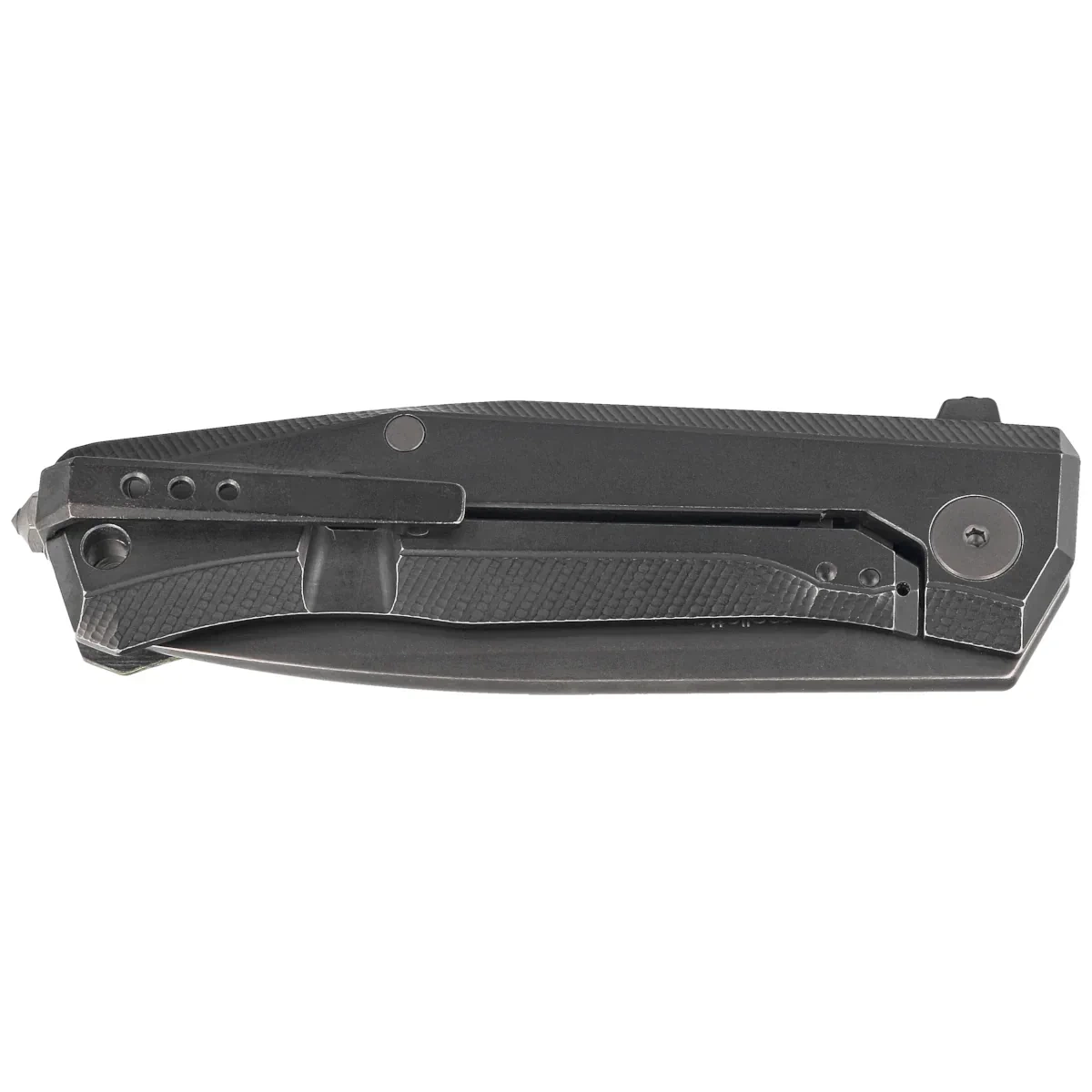 Handle - the presentation side is made of Toxic Storm Fat Carbon, the locking side is made of solid titanium 6AI4V. The sheaths are attached to a CNC-milled titanium backspacer, which provides the desired rigidity and strength to the overall design. The titanium Solid® clip allows the knife to be carried in tip-up position. The clip is bolted to the titanium frame with a tungsten carbide screw/glass striker. In the back of the grips a lanyard hole, a hole for a line.