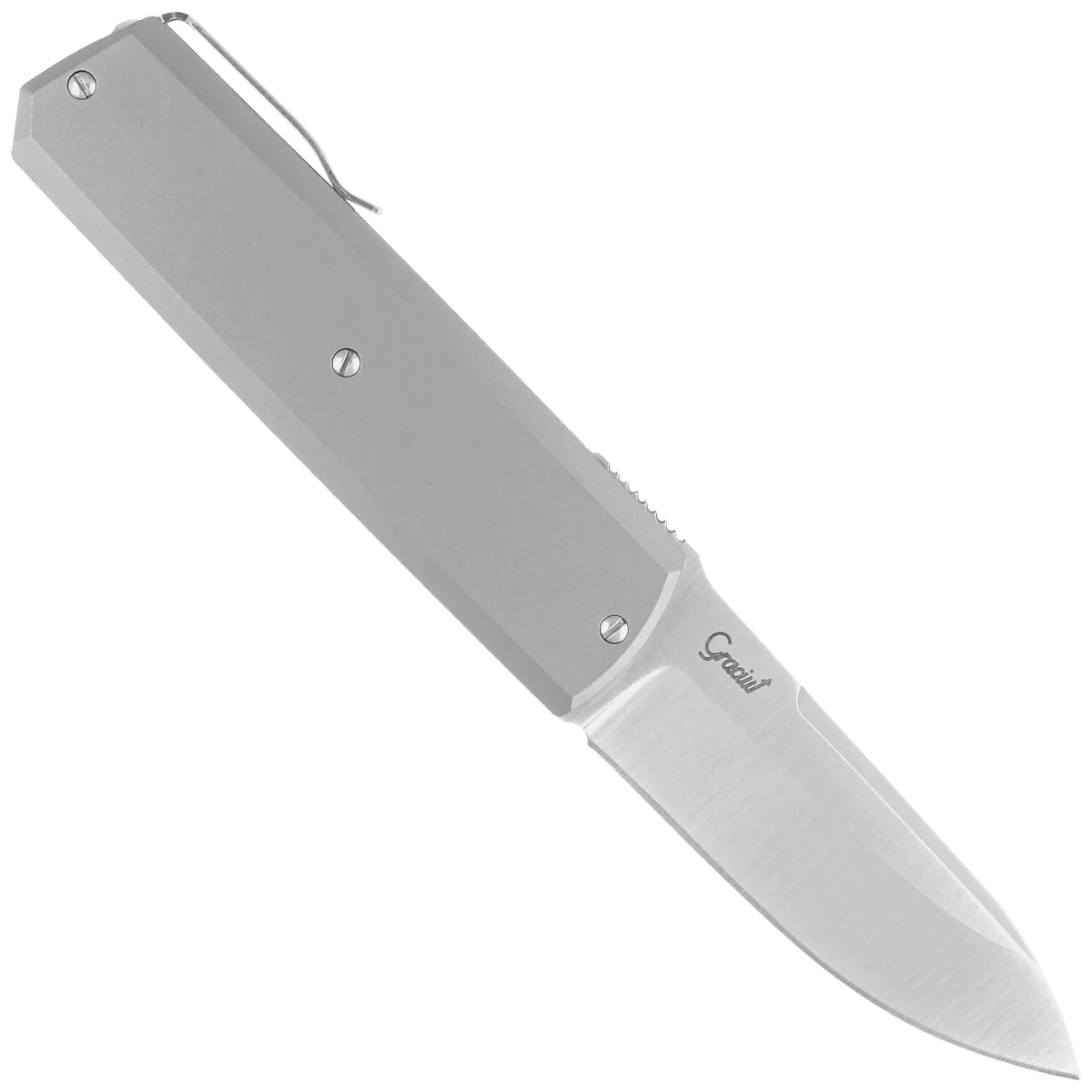• 410 Silver Grey Titanium, Satin, a beautifully crafted folding knife with a versatile blade. The result of a collaboration between Italian knifemaker Bruno “Graciut” Bruna and Maserin. A simple titanium handle that fits any hand a blade made ELMAX steel!