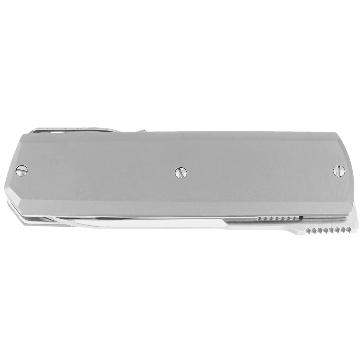 Handle - grips made of titanium, attached to an artful backspacer. The straight line of the facings allows the Handle grips to fit almost any hand, regardless of its size or grip preference. A steel deep-carry clip located on the back of the handle allows the knife to be carried in a pocket in a tip-up position.