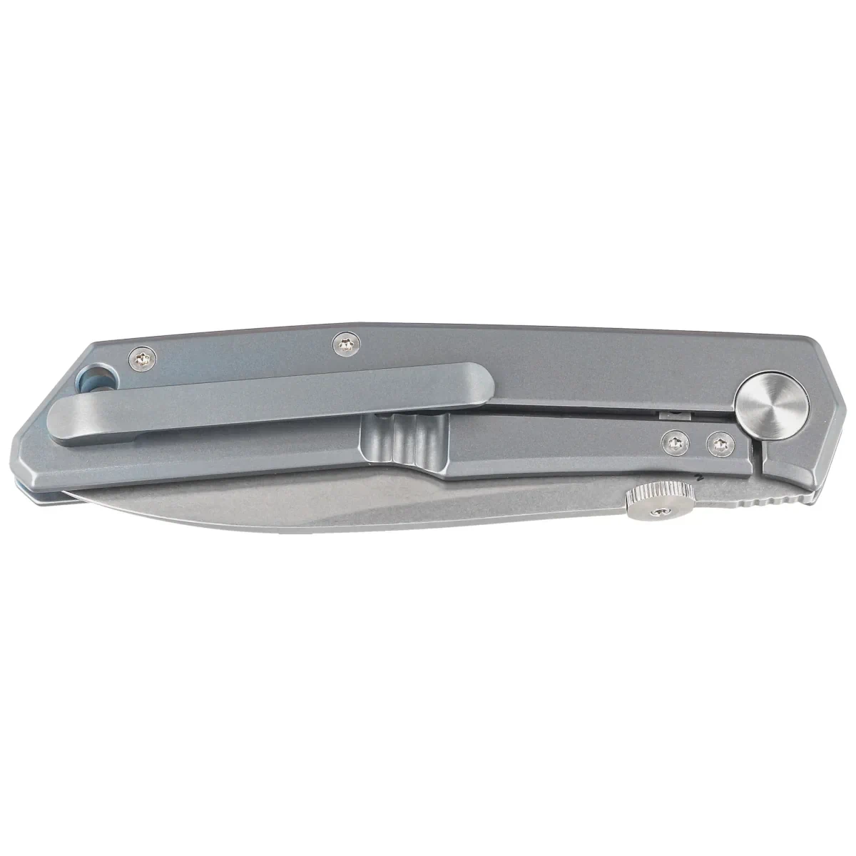 Handle - beveled titanium grips, slightly profiled. Open-backed design - so called open-backed attached to each other with steel spacer sleeves reduces weight and facilitates cleaning. Simple, solid construction gives you the assurance of many years of use. In the back there is a lanyard hole, which is a place for a safety or decorative cord. A single-position (right) titanium clip allows you to carry the knife discreetly in your pocket in tip-up position (blade tip up).