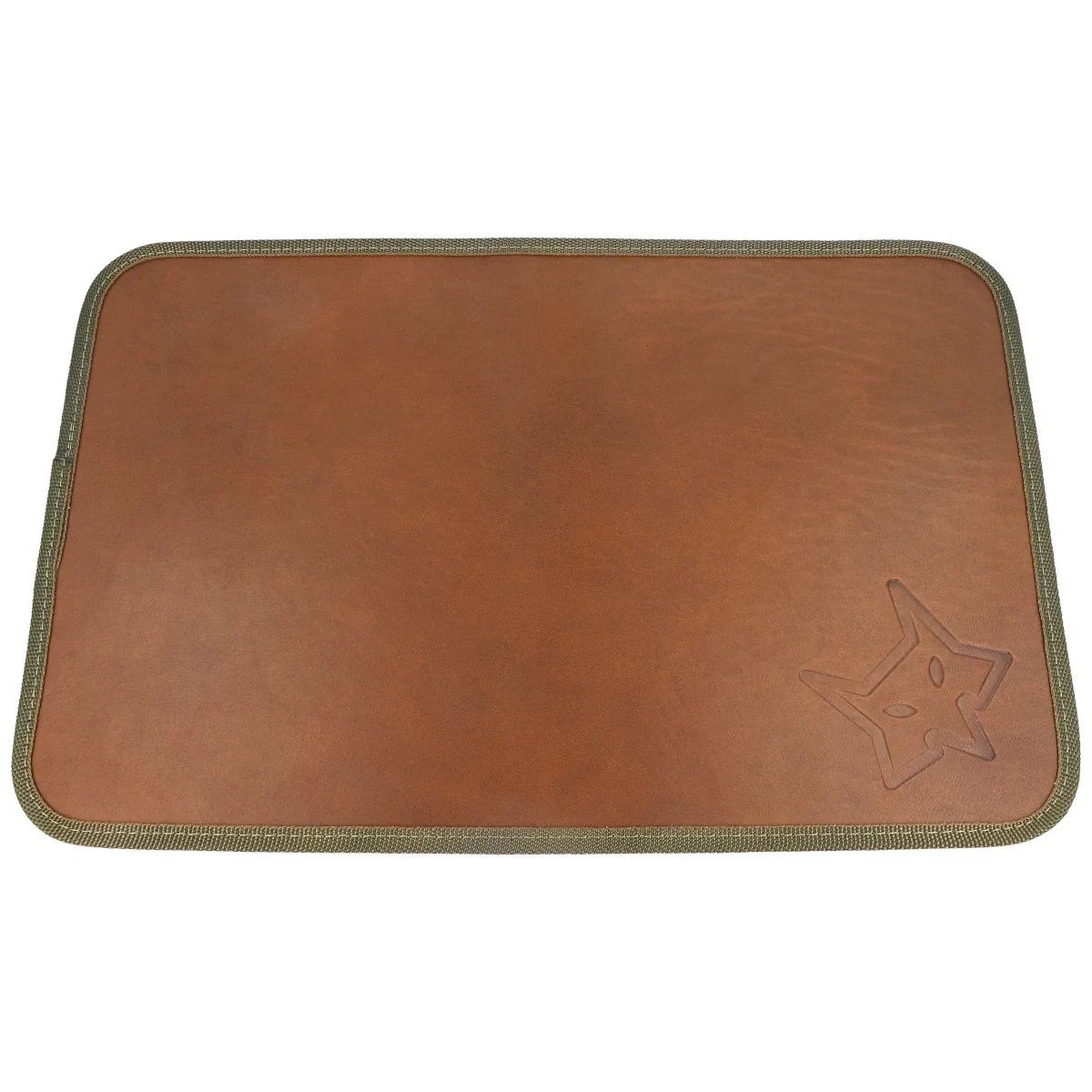 • Fox Green Leather Mat, a leather table or desk mat for displaying knives, the perfect accessory for stylishly showcasing your collection. Made of high-quality leather, the mat provides an elegant and durable surface for displaying your favorite knives.