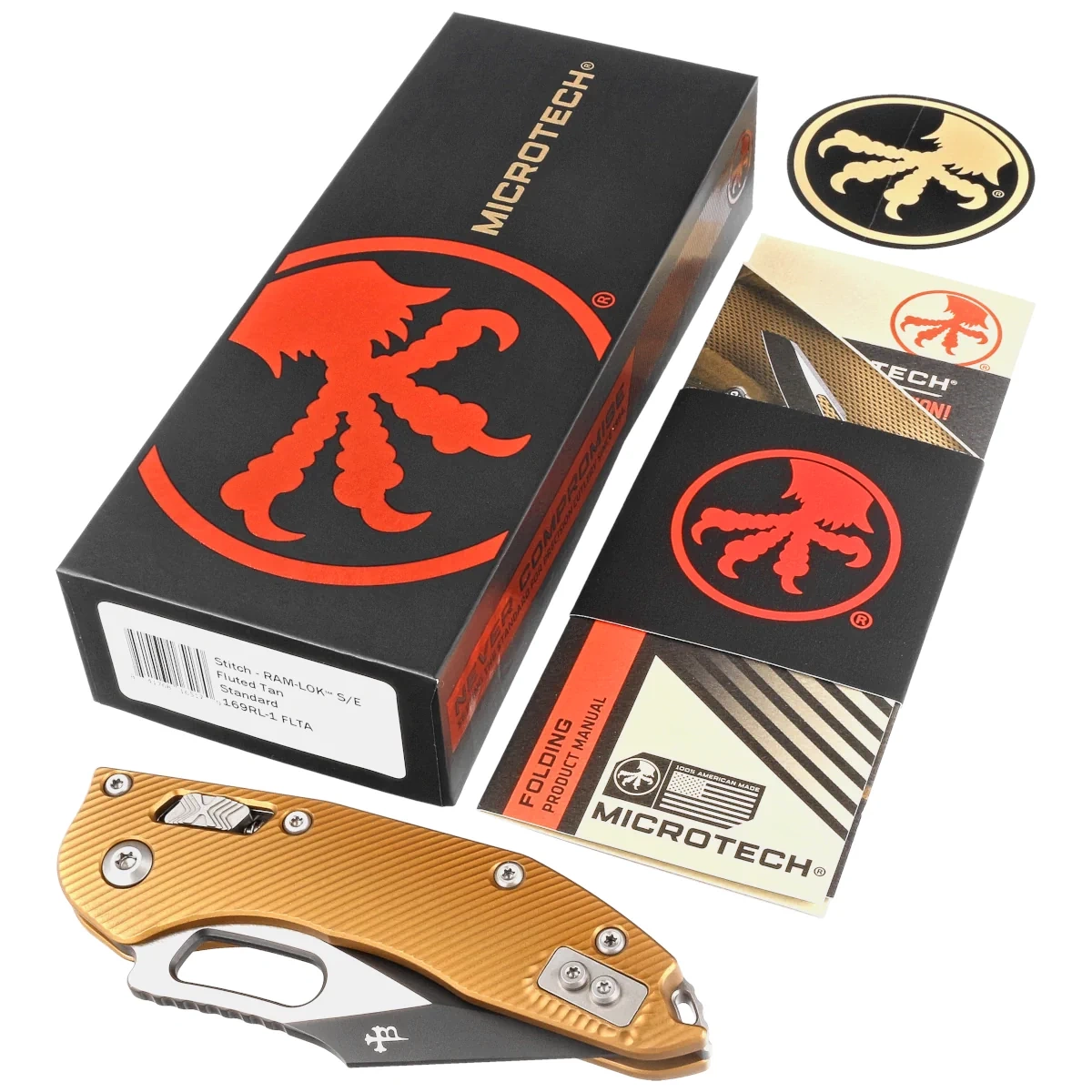 - Stitch Ram-Lok S/E Fluted Tan Aluminum, Black manual version of the popular design by Sebastijan Berenjie of Borka Blades and Microtech. Wide harpoon-shaped blade, superior materials and legendary quality workmanship from Microtech Knives.