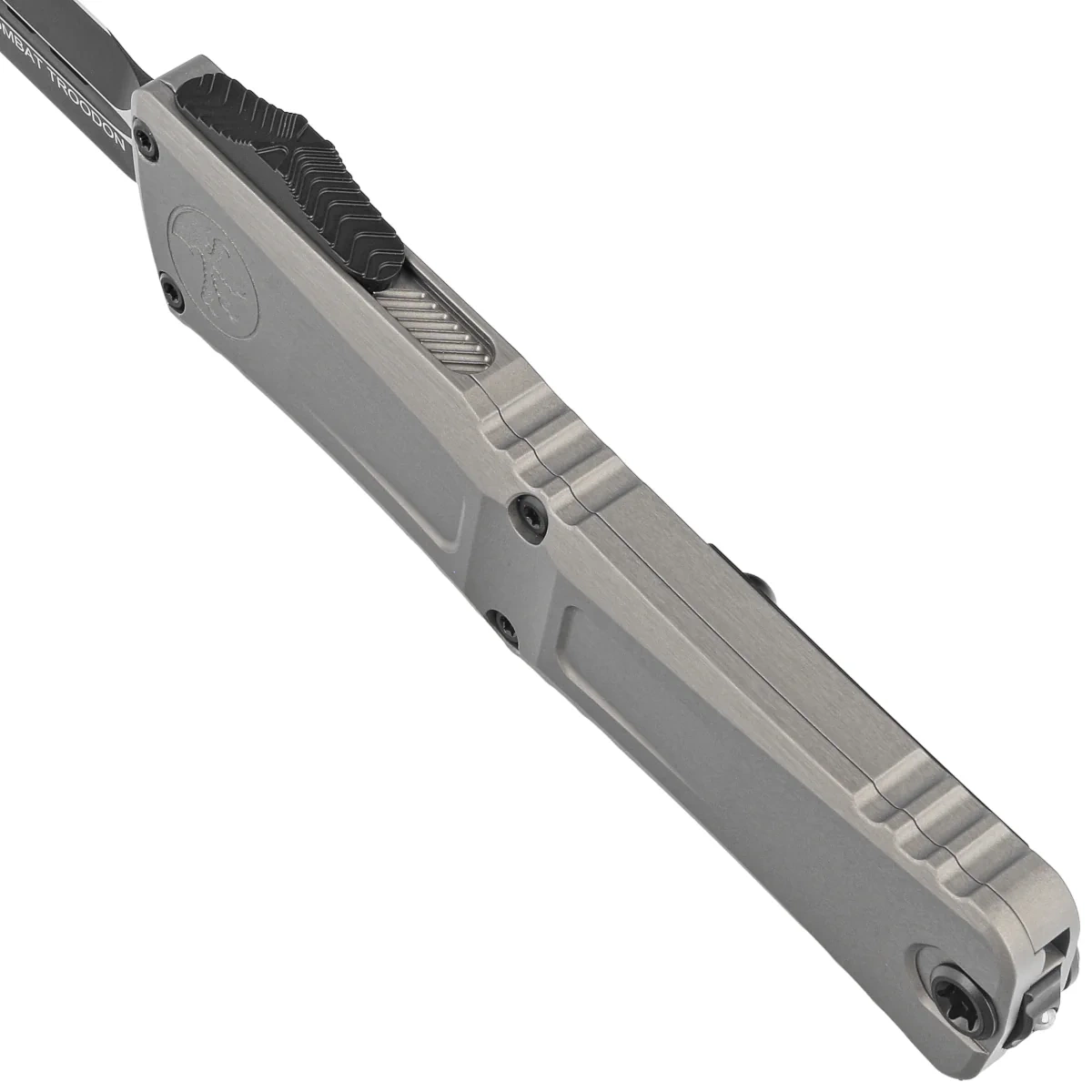 Combat Troodon Gen III D/E Natural Clear Aluminum, Black this largest of automatic knives represents the pinnacle of precision engineering and tactical prowess in the realm of OTF (Out The Front) knives. Designed for a wide range of utility applications, it boasts a size 25% larger than the flagship Troodon. Precisely crafted, it features a sophisticated and hellishly fast mechanism that extends the razor-sharp blade. It is 100% made and assembled in the USA. The design is by Anthony Marfione, knifemaker and owner of Microtech Knives.