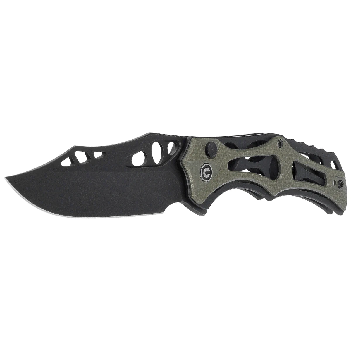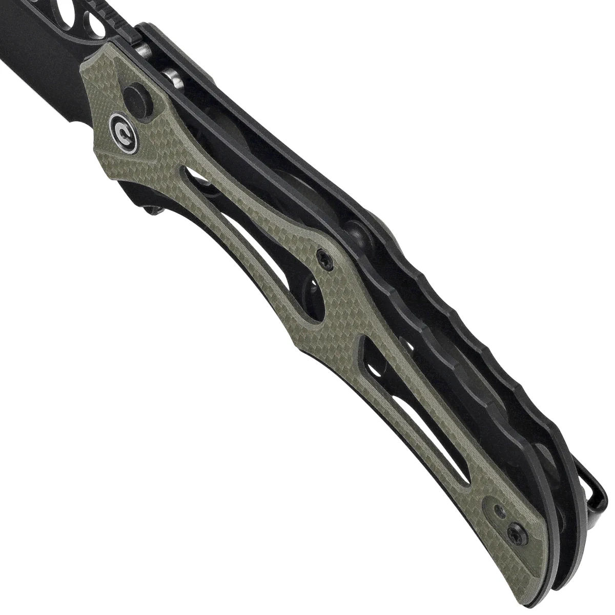Handle - skeletonized, made of aluminum, to which heavily cut G10 composite grips were screwed . This gives the fingers plenty of support points for a secure grip. A fore finger groove made at the front improves ergonomics. The open-backed design, fixed with steel spacer sleeves, reduces weight and facilitates cleaning. The simple, secure design gives assurance of many years of use. Thanks to all these design measures, the full-size folder reaches a staggering 75g in weight. The pivot axis is adorned with a stylized Civivi brand logo . The two-position (right/left), deep-carry clip allows you to carry the knife discreetly in your pocket in tip-up position (blade tip up).